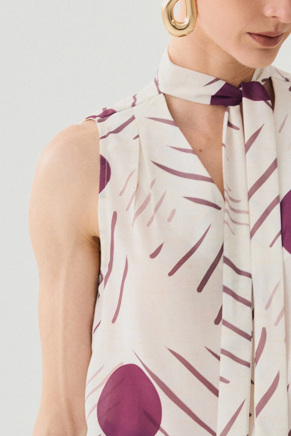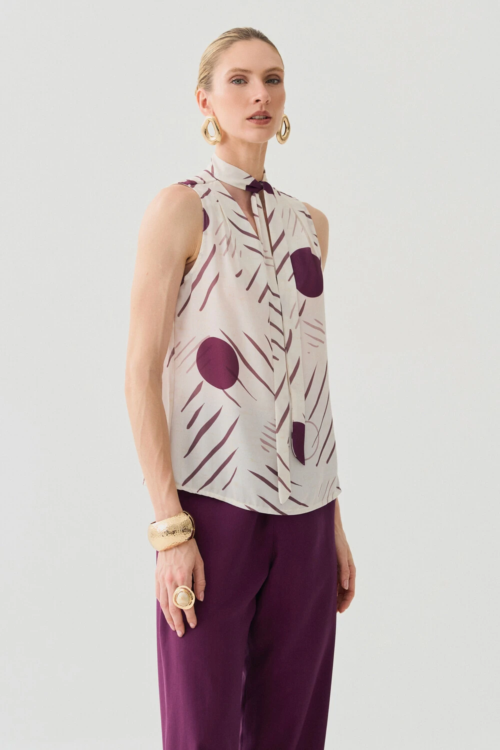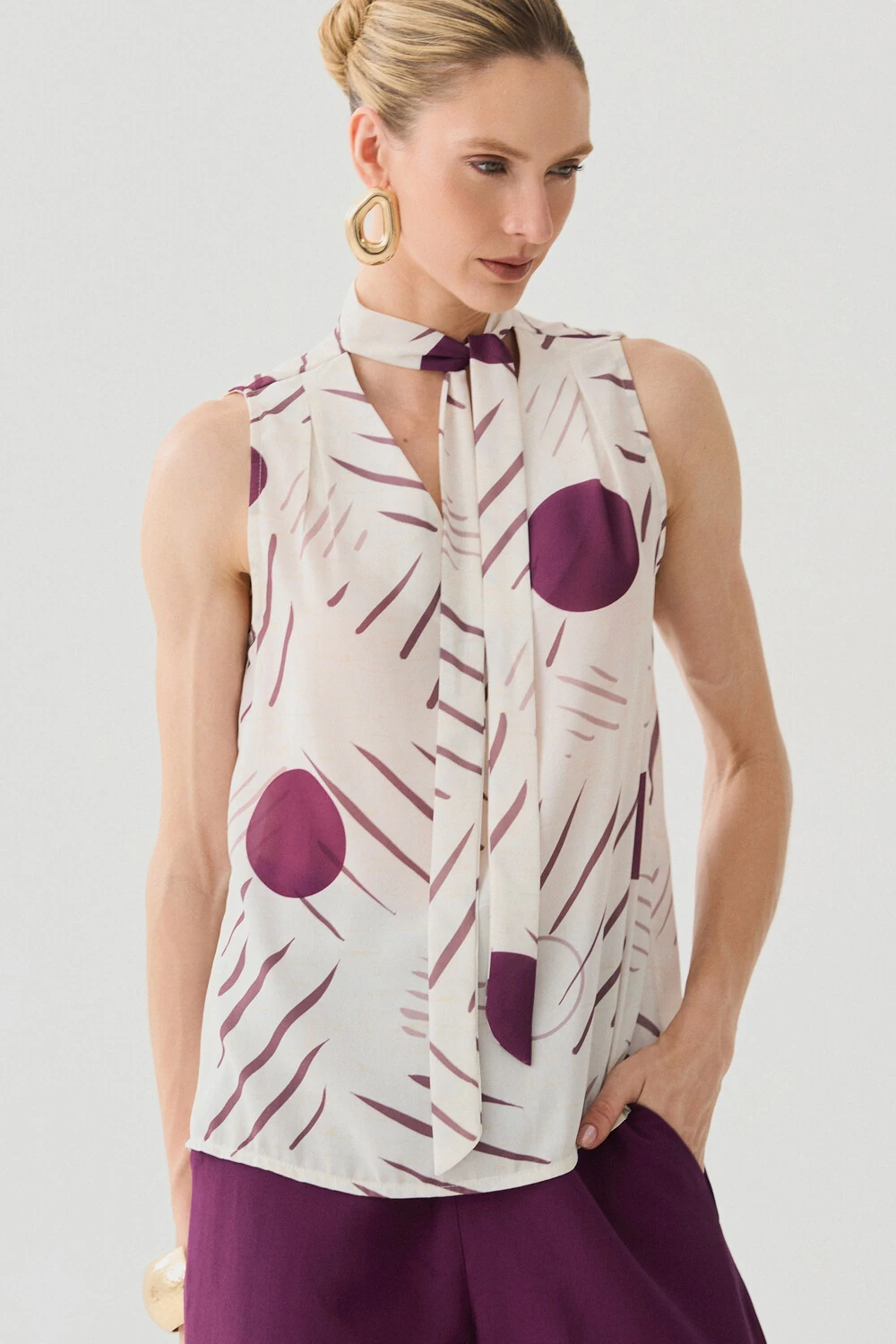 Blusa estampada de crepe com design contemporâneo, combinando formas orgânicas e traços geométricos, trazendo modernidade e personalidade à peça.
