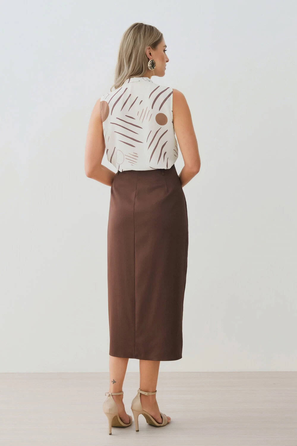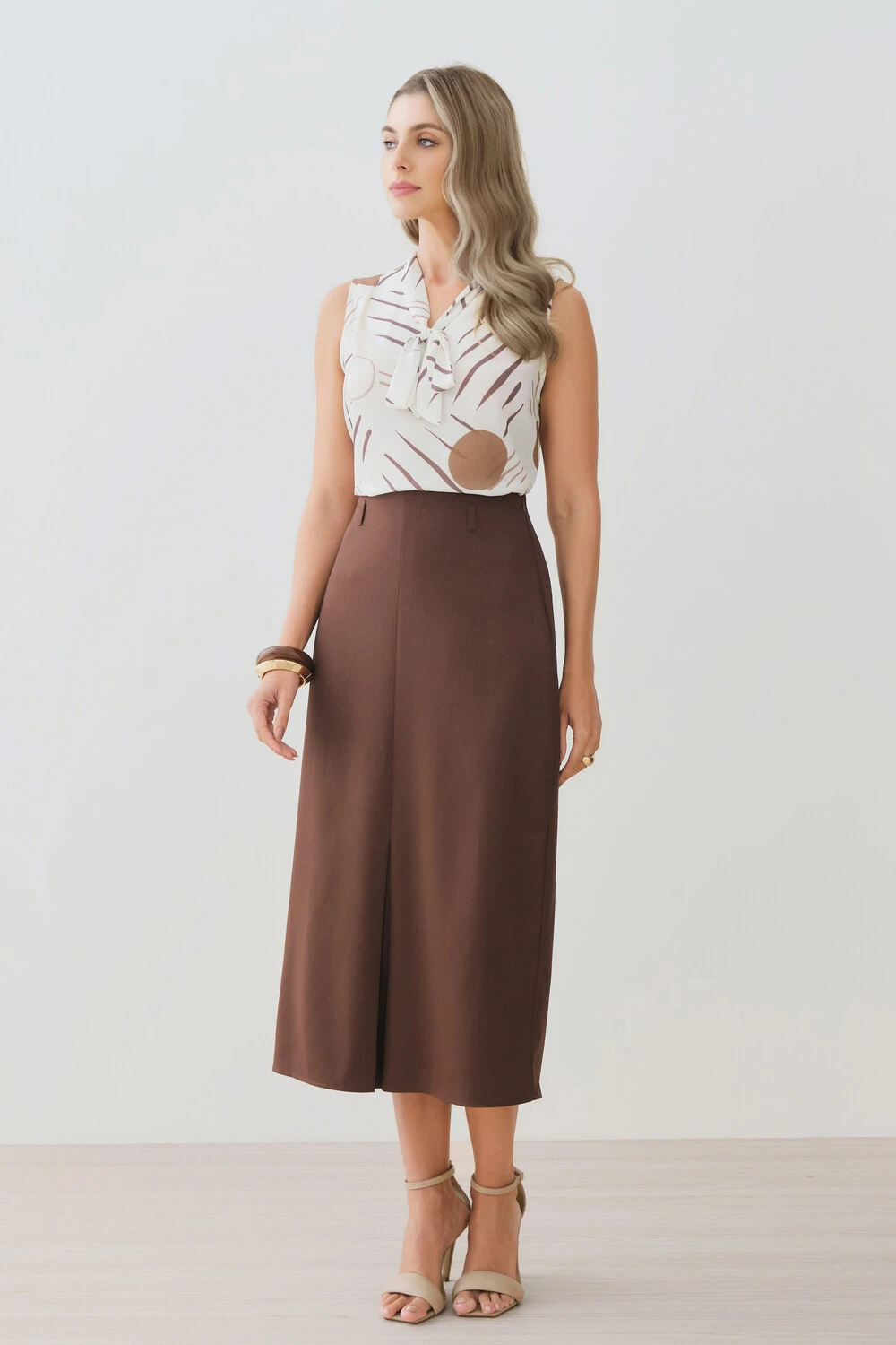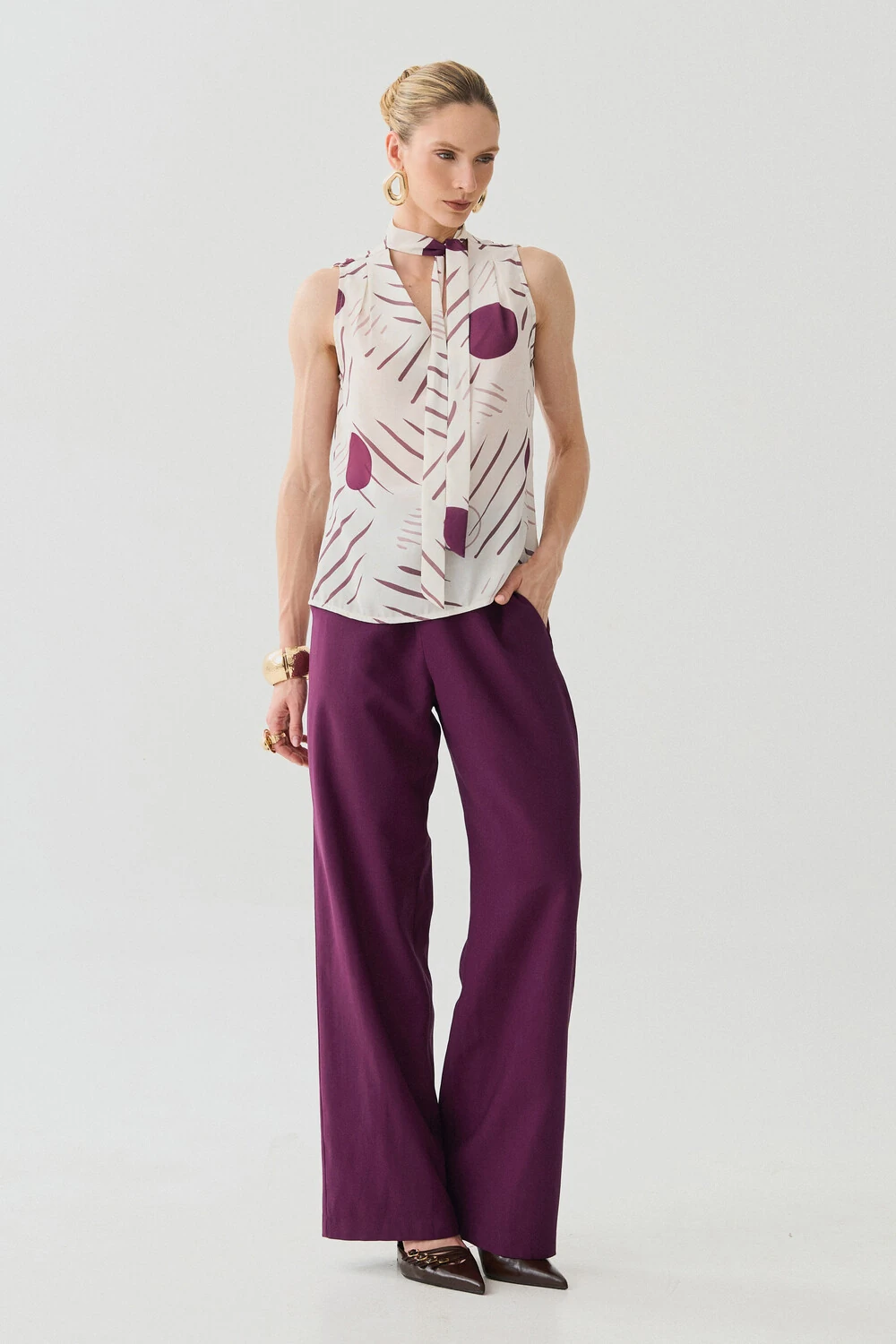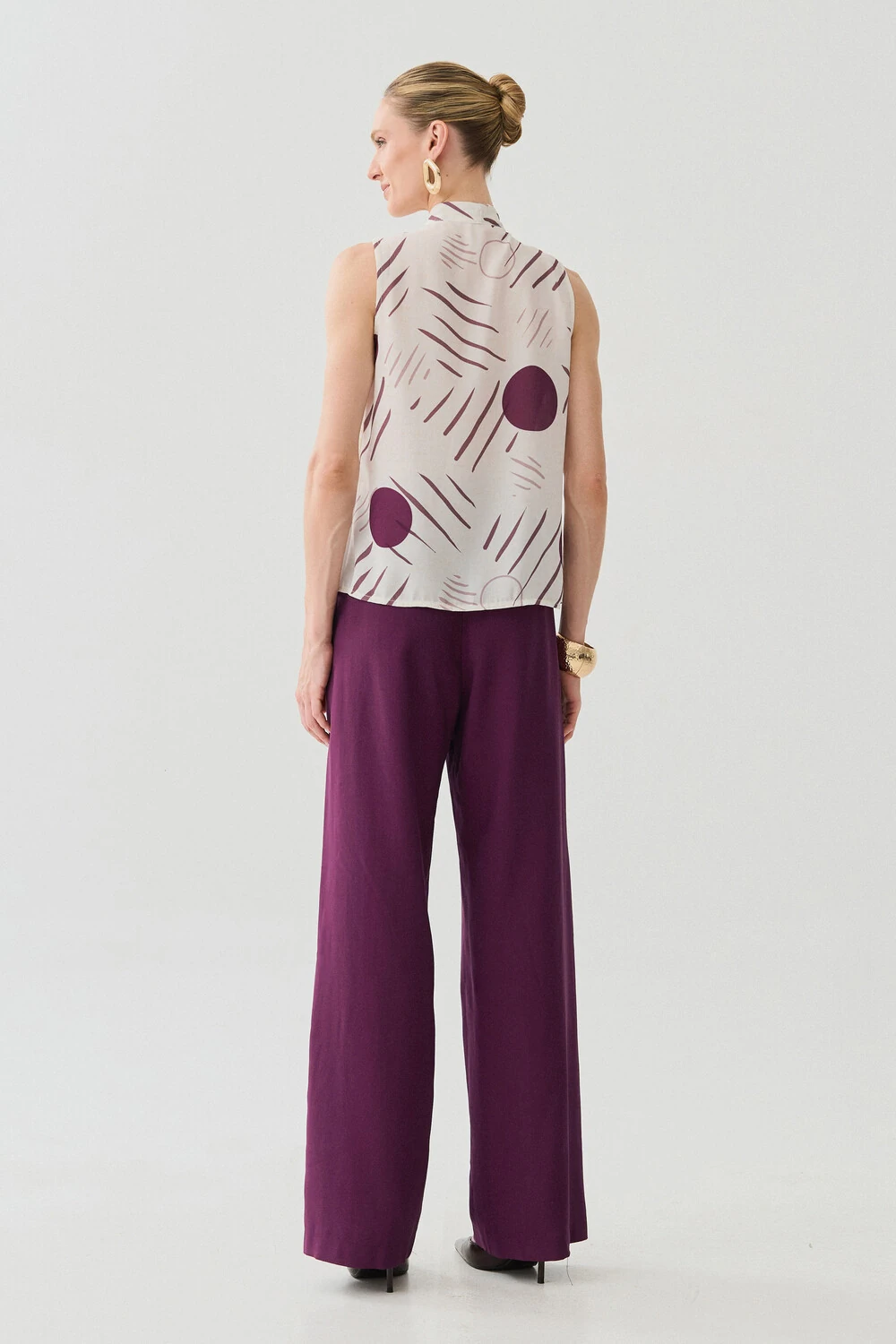Blusa estampada de crepe com design contemporâneo, combinando formas orgânicas e traços geométricos, trazendo modernidade e personalidade à peça.
