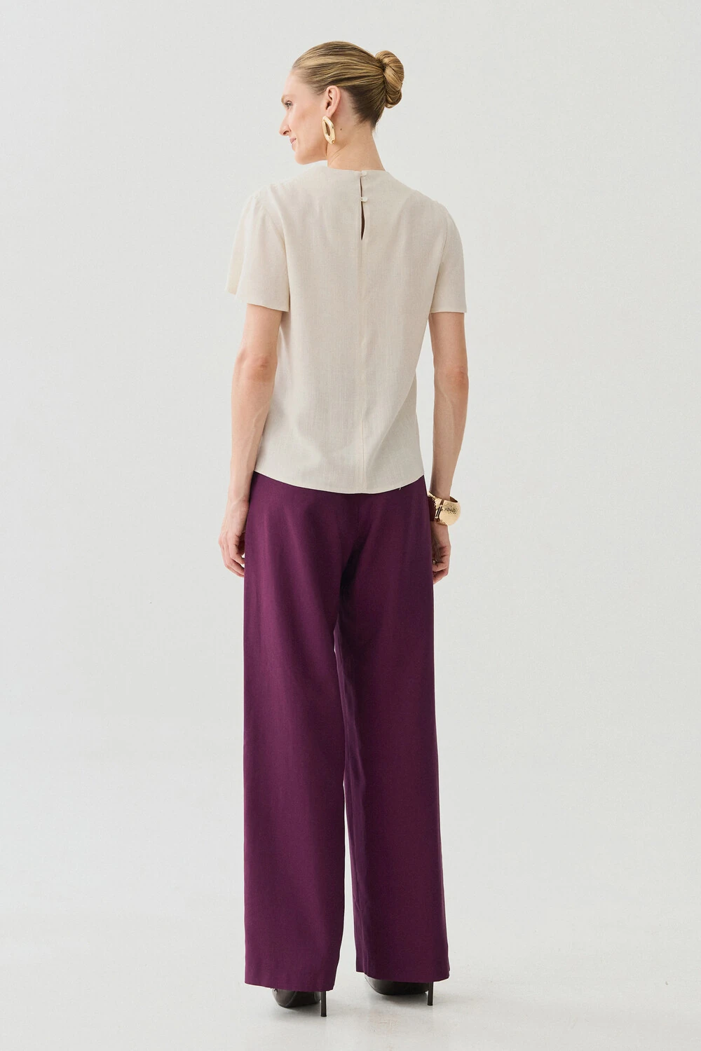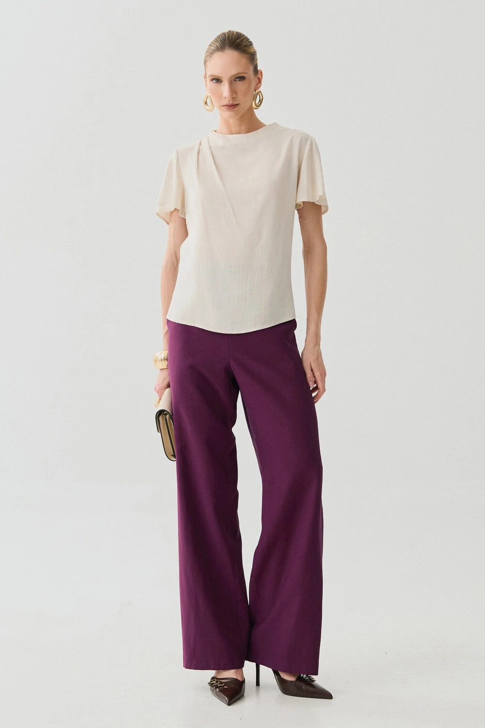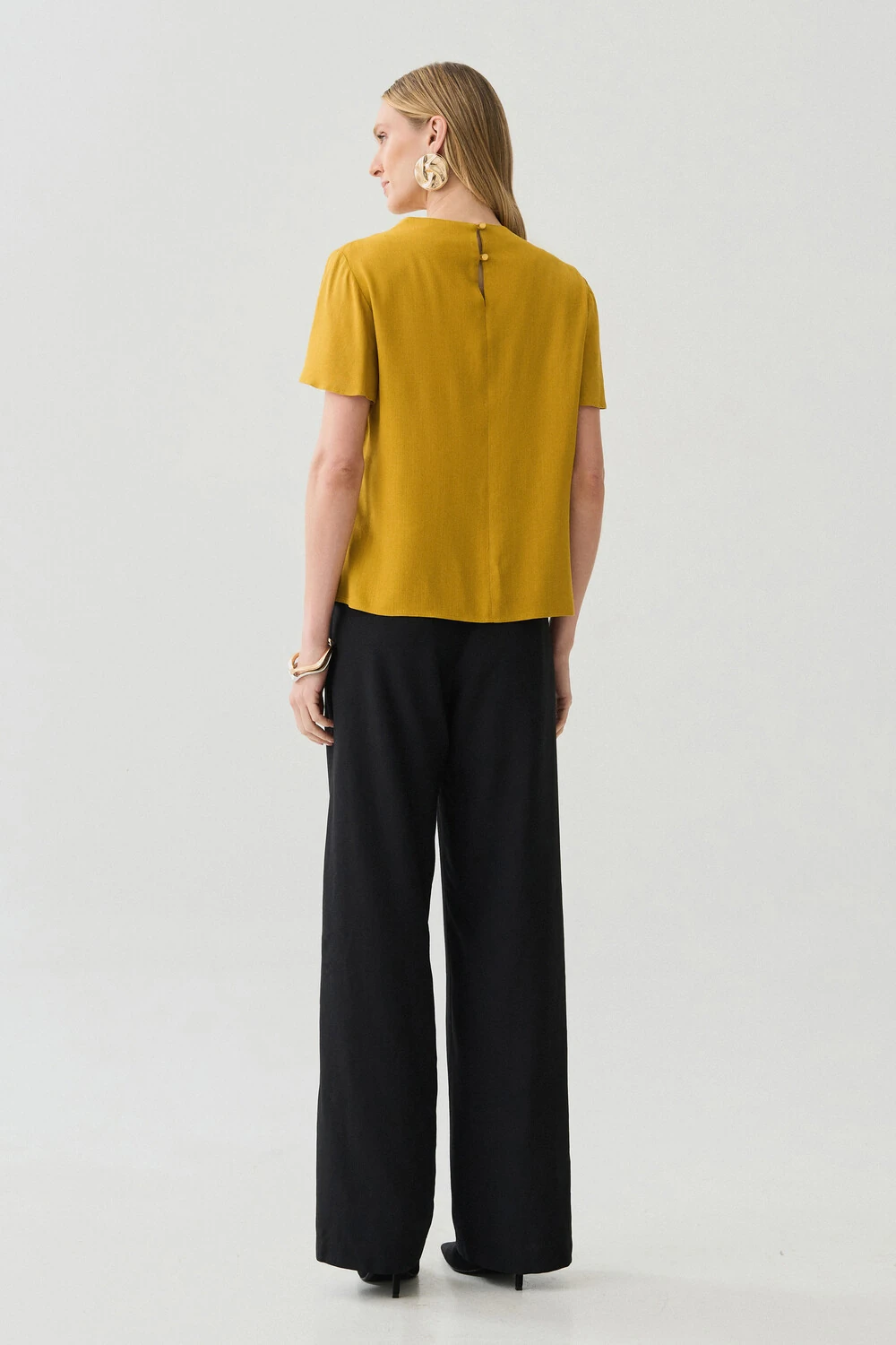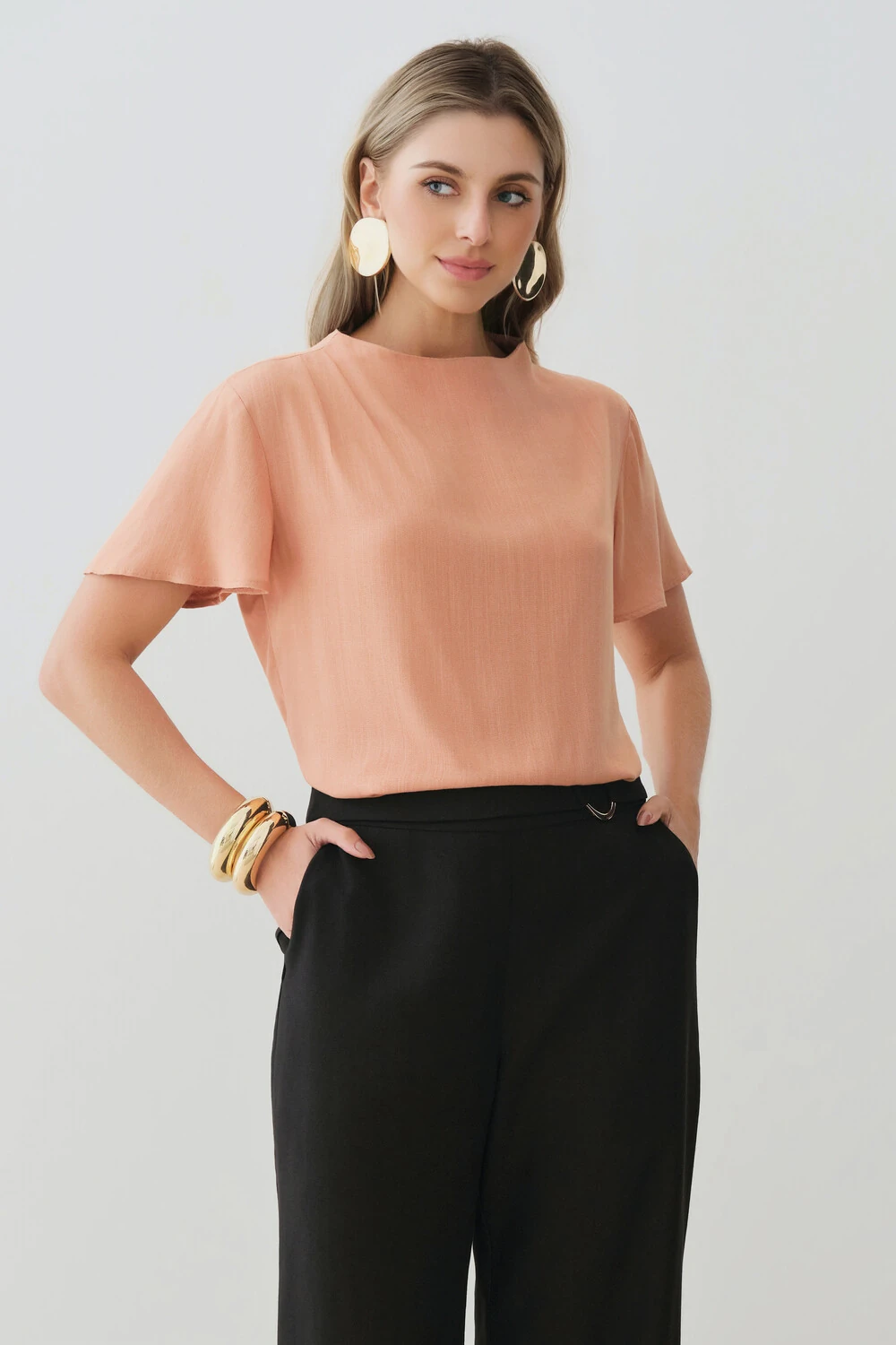 Blusa com design minimalista e modelagem reta, ideal para composições elegantes e versáteis.