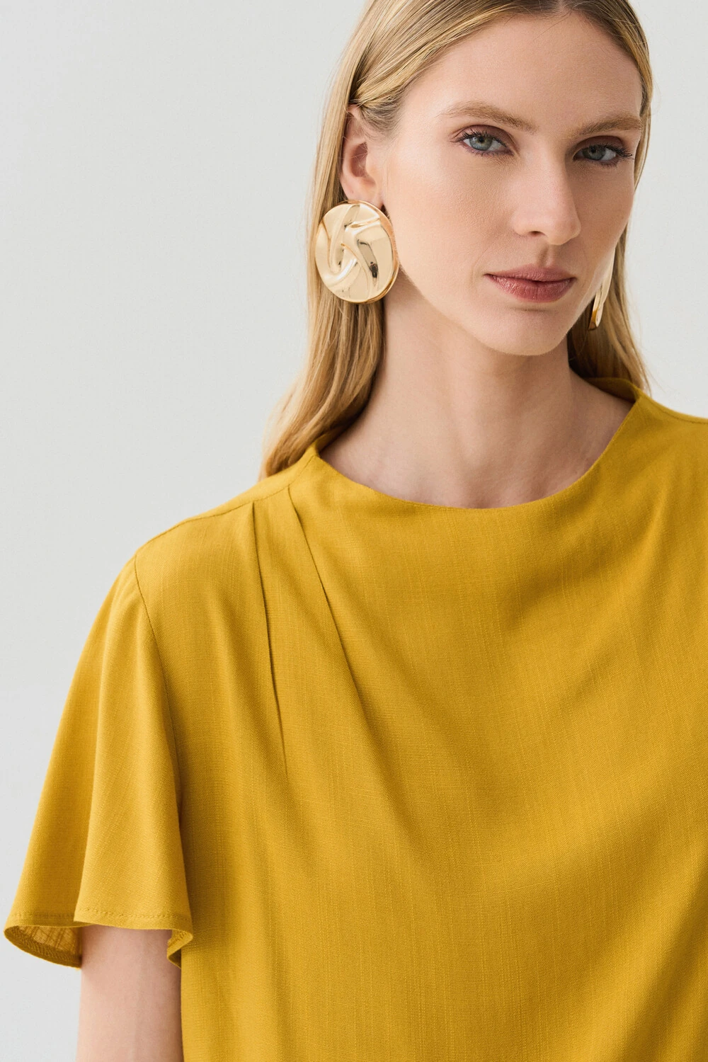 Possui gola careca baixa e construção assimétrica, com pregas aplicadas no ombro direito que criam leve efeito drapeado, agregando movimento e sofisticação ao visual.