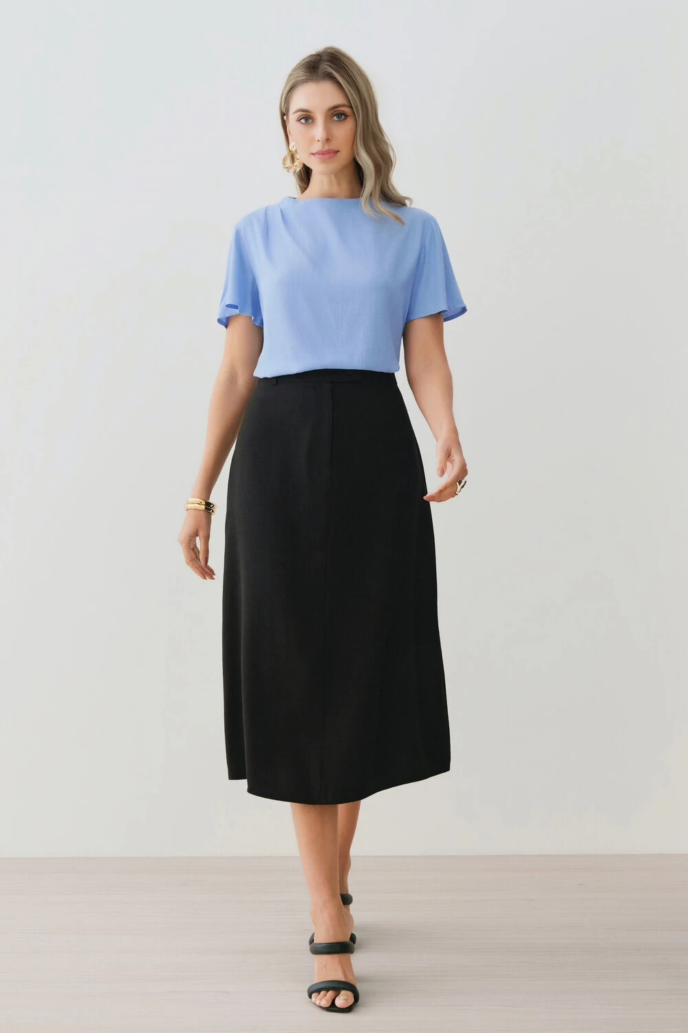 As mangas curtas têm caimento leve, complementando a fluidez da peça com delicadeza.