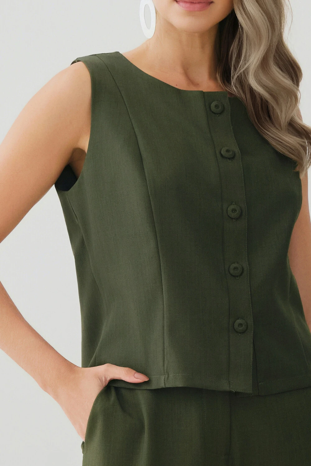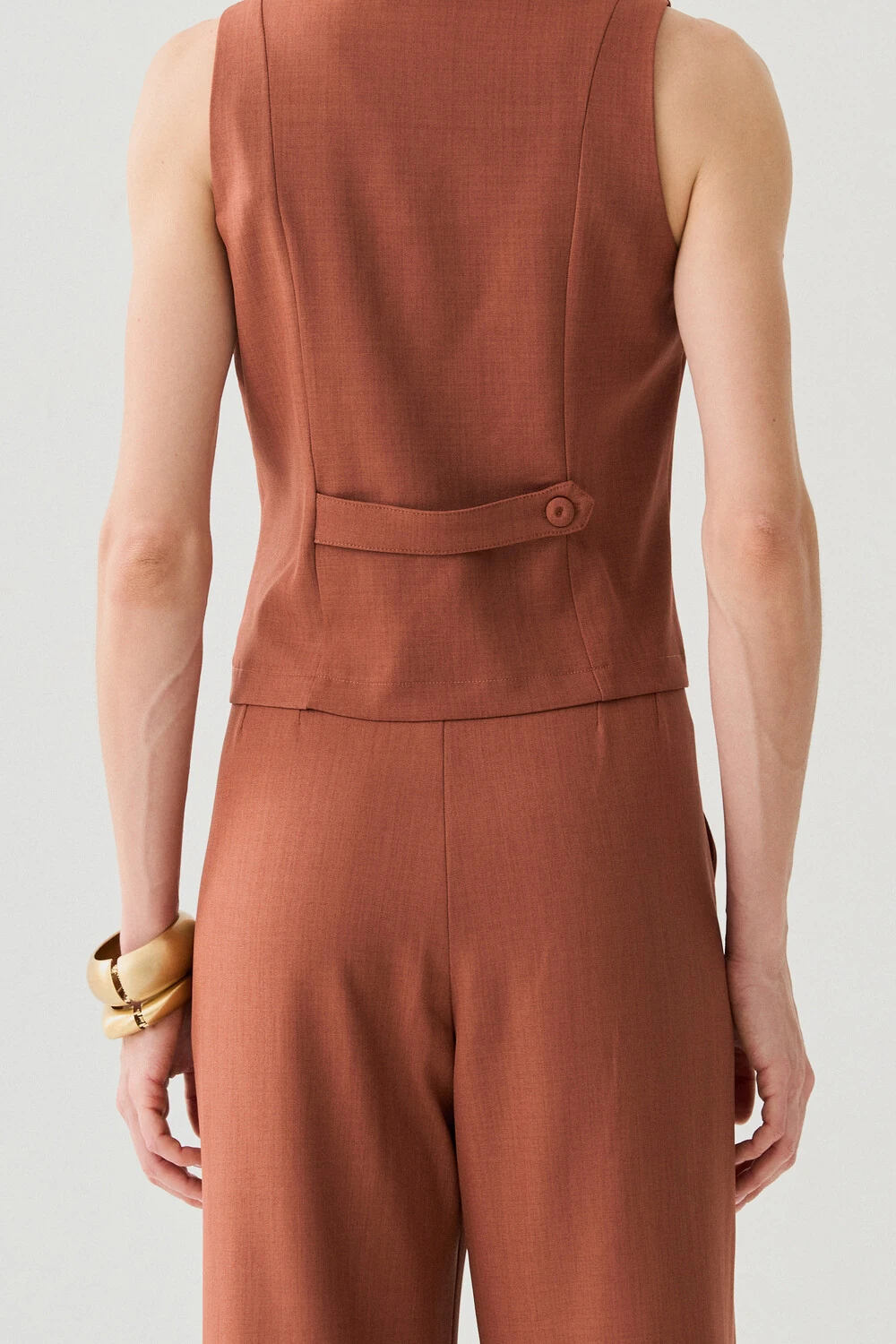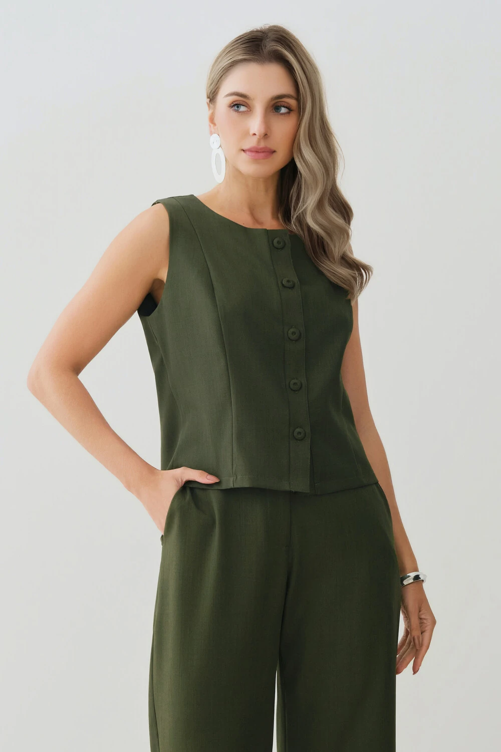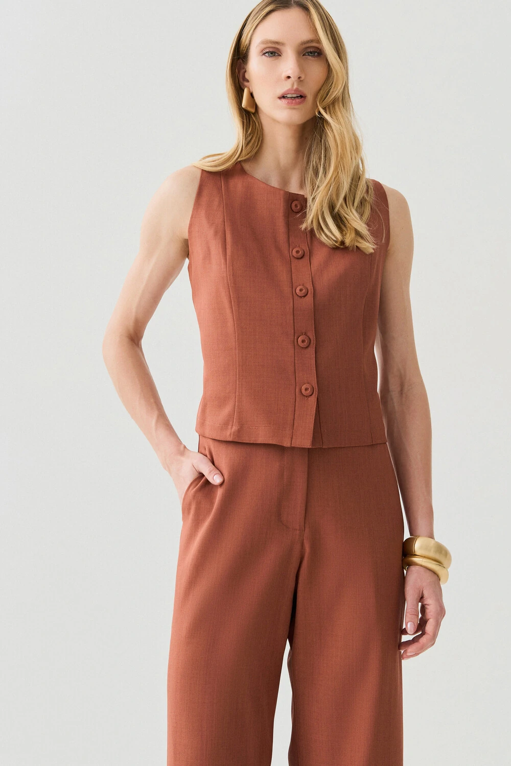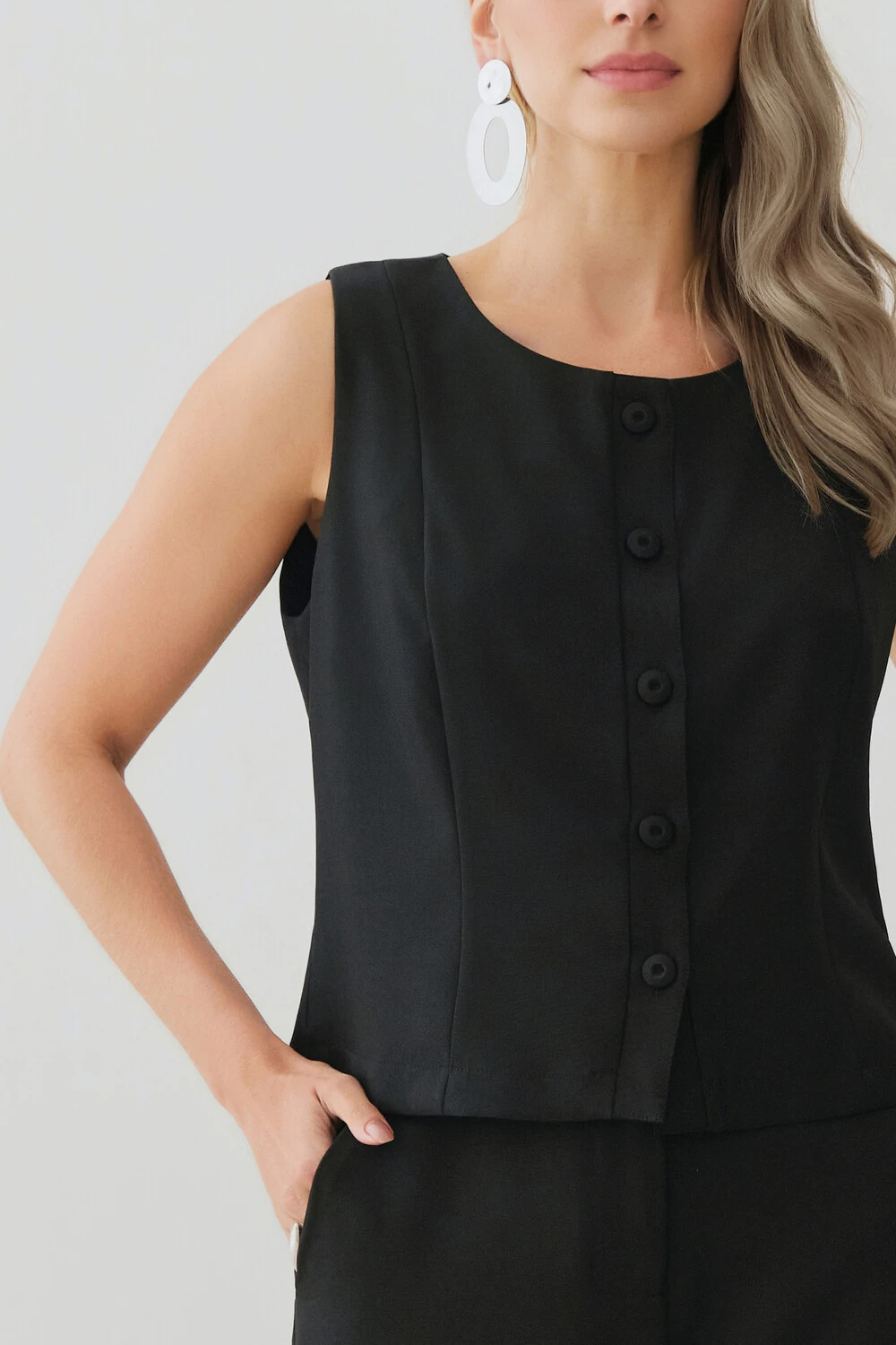 A camisa regata estilo colete possui modelagem levemente acinturada, decote redondo e botões forrados frontais, agregando acabamento sofisticado ao visual. Apresenta recortes frontais que estruturam a silhueta e, nas costas, detalhe em martingale com botão forrado, reforçando o design refinado da peça.