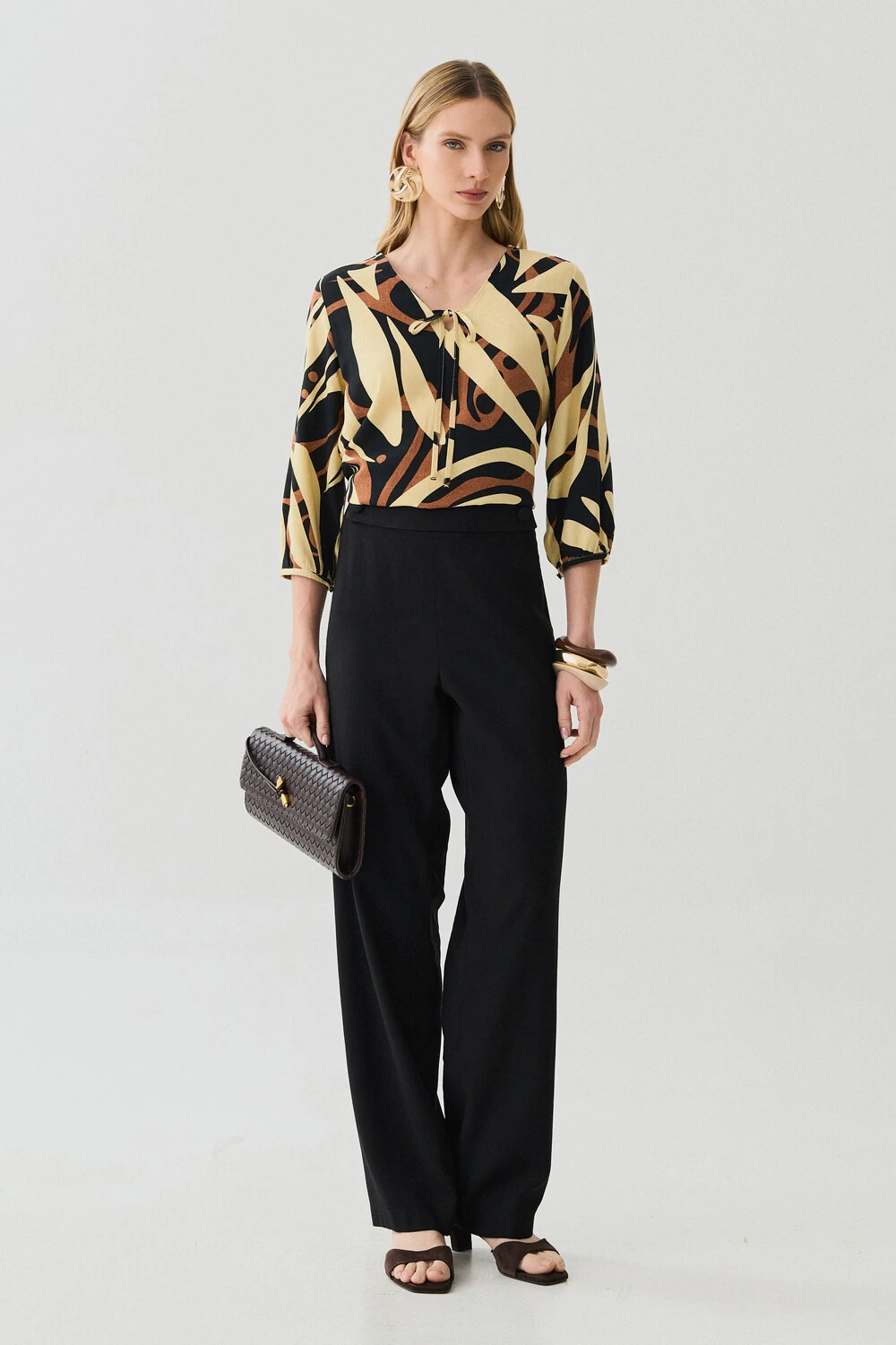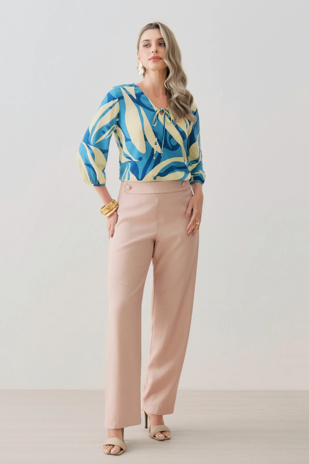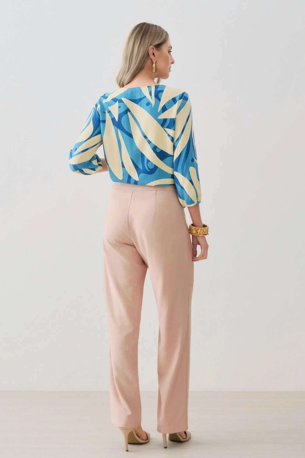 As mangas 3/4 apresentam leve volume e acabamento ajustado nos punhos, complementando a proposta elegante da peça.