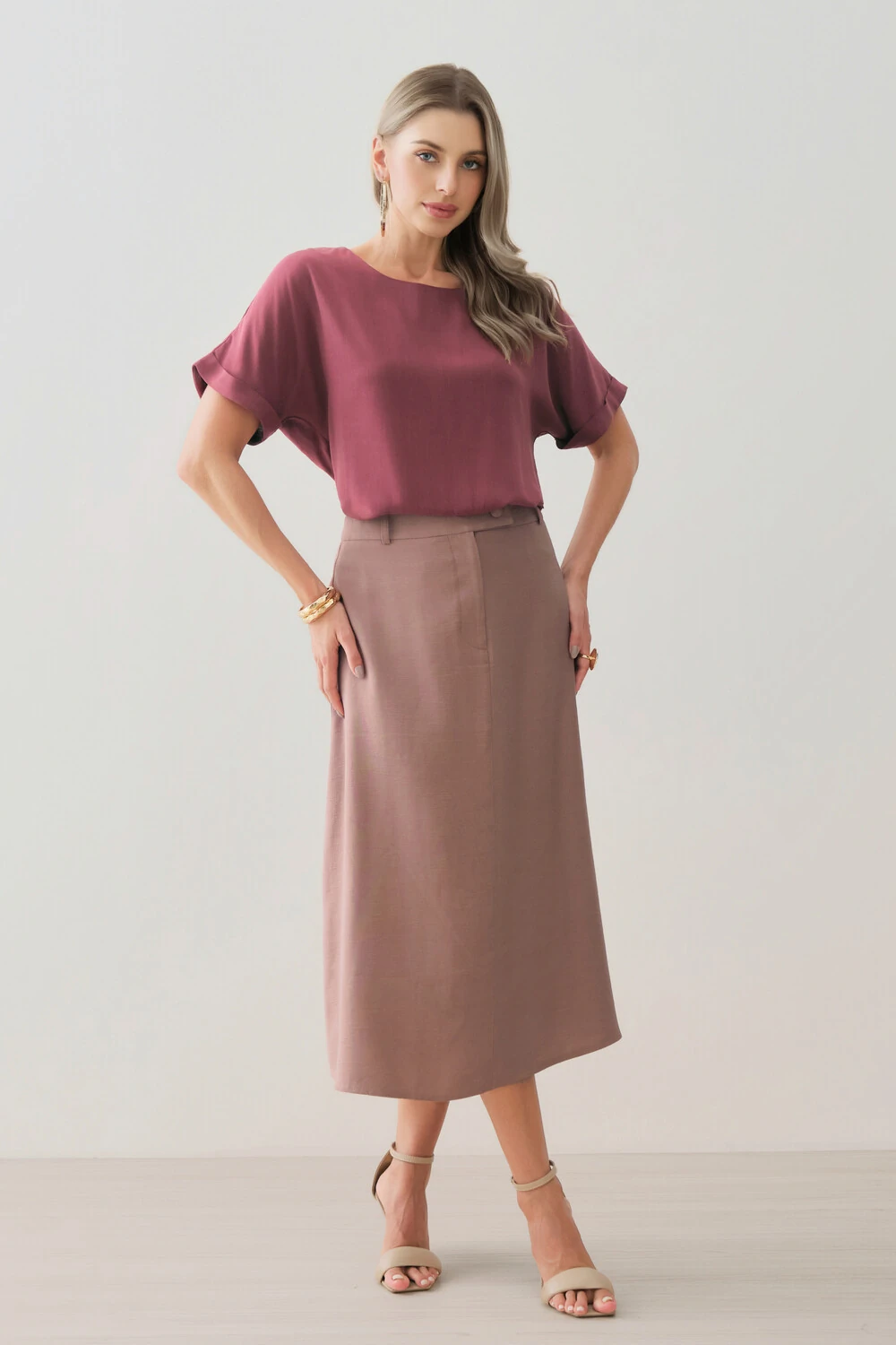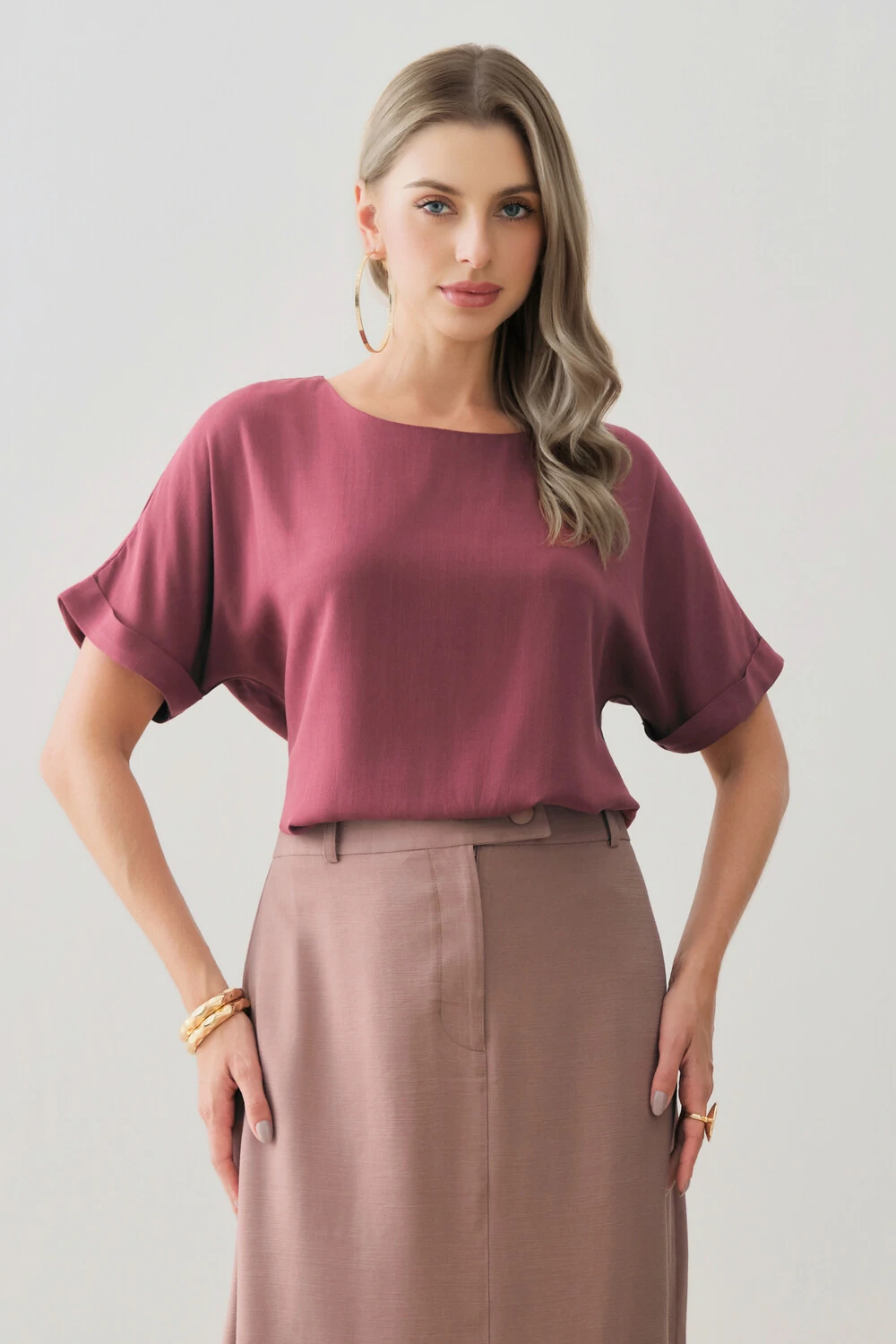 Blusa confeccionada em tecido de toque leve e caimento fluido, com textura sutil que traz delicadeza e sofisticação ao visual.