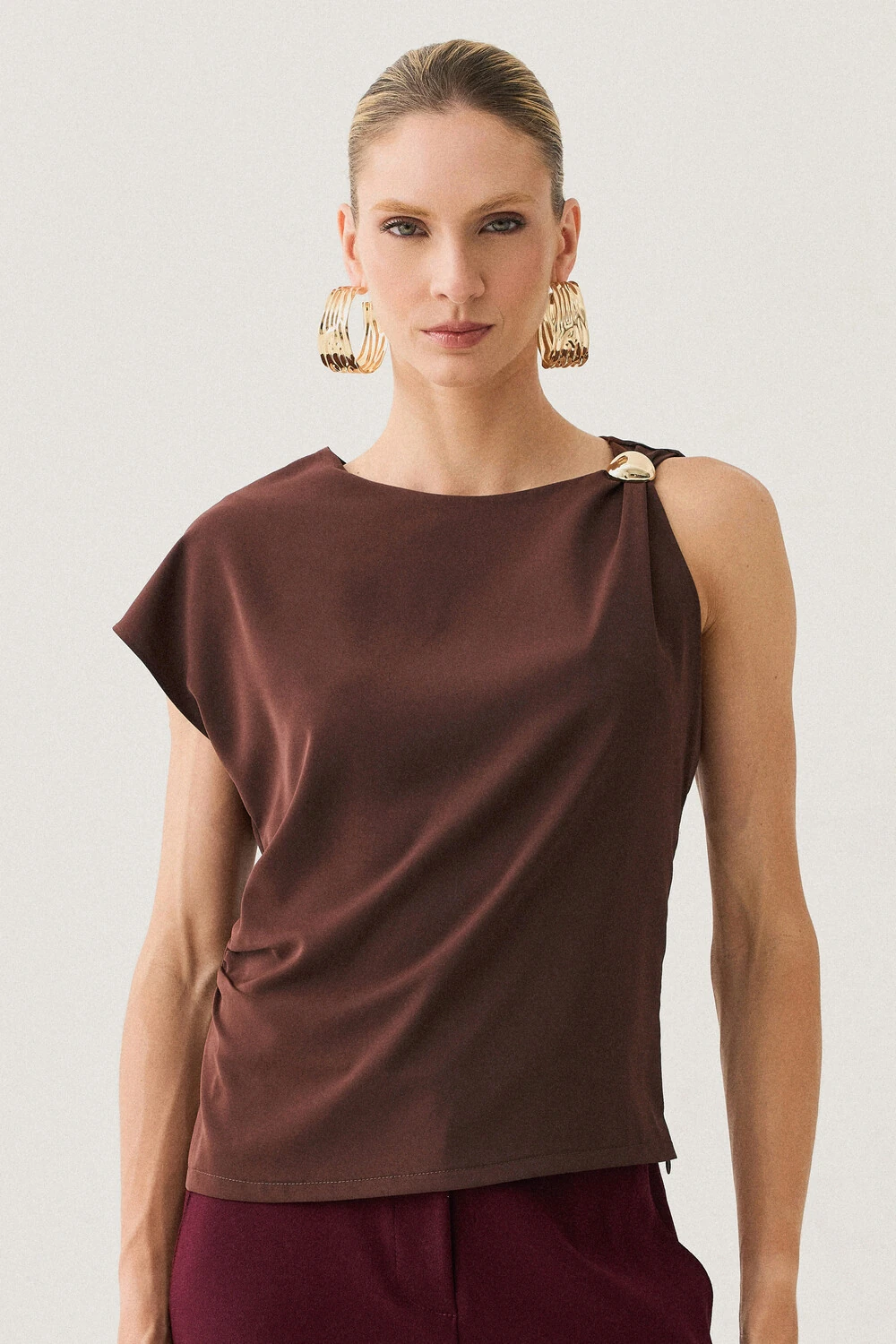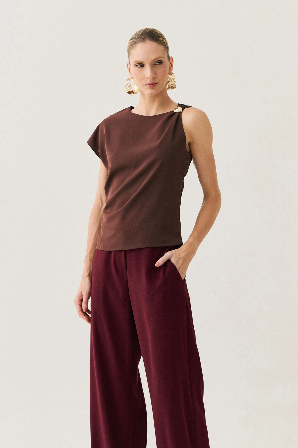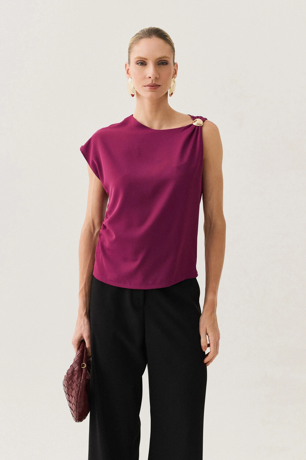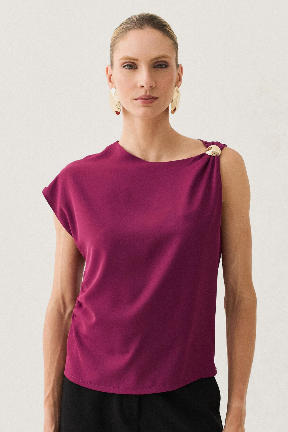 A modelagem sem mangas conta com ombro estendido de um lado, criando um efeito assimétrico sutil e contemporâneo, enquanto o franzido lateral valoriza o caimento com delicadeza.