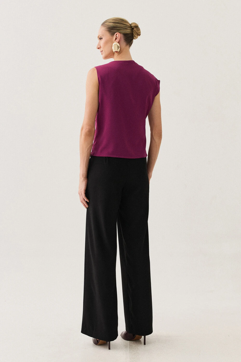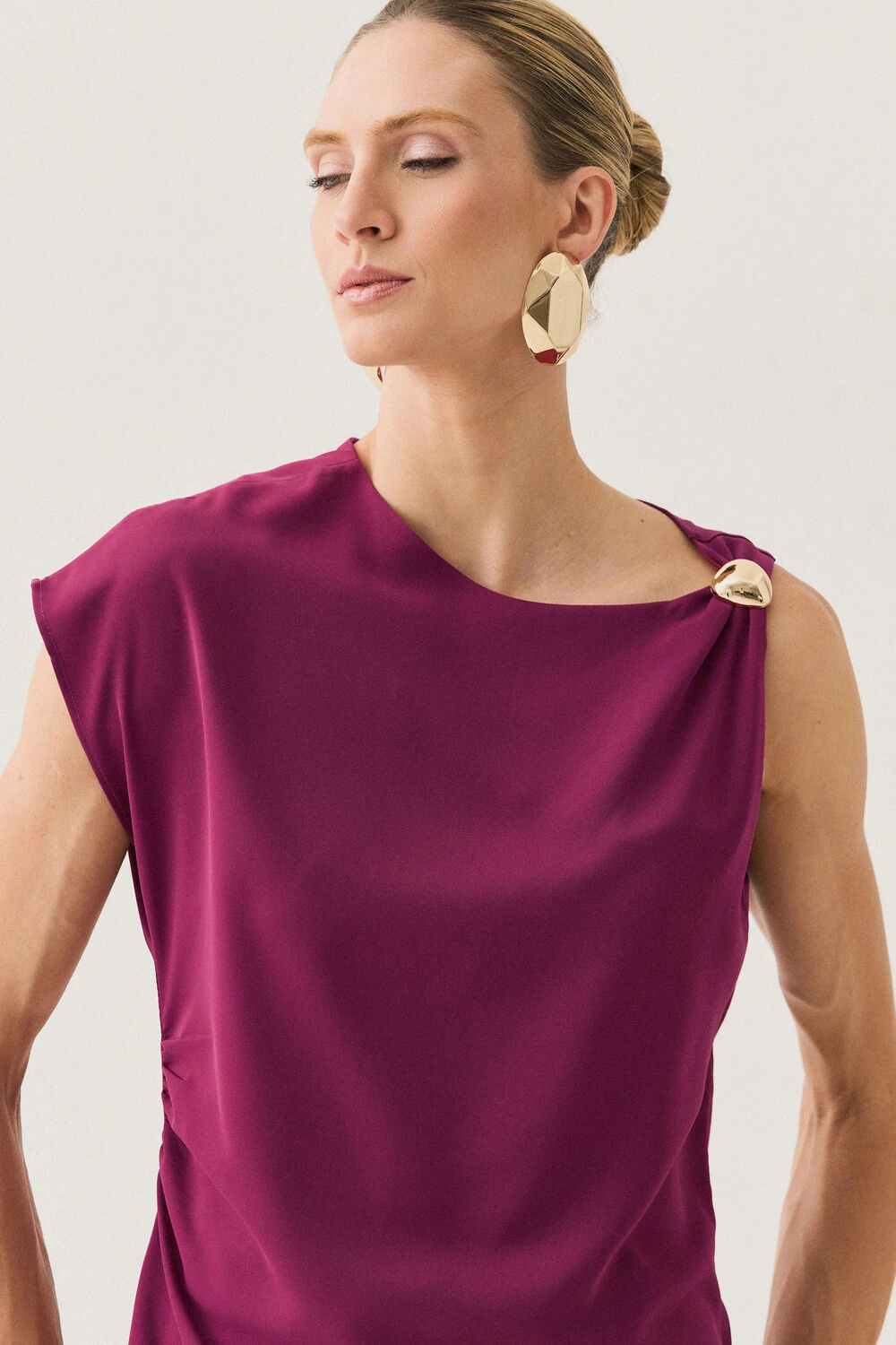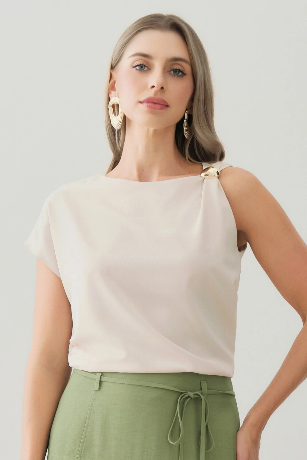 A modelagem sem mangas conta com ombro estendido de um lado, criando um efeito assimétrico sutil e contemporâneo, enquanto o franzido lateral valoriza o caimento com delicadeza.