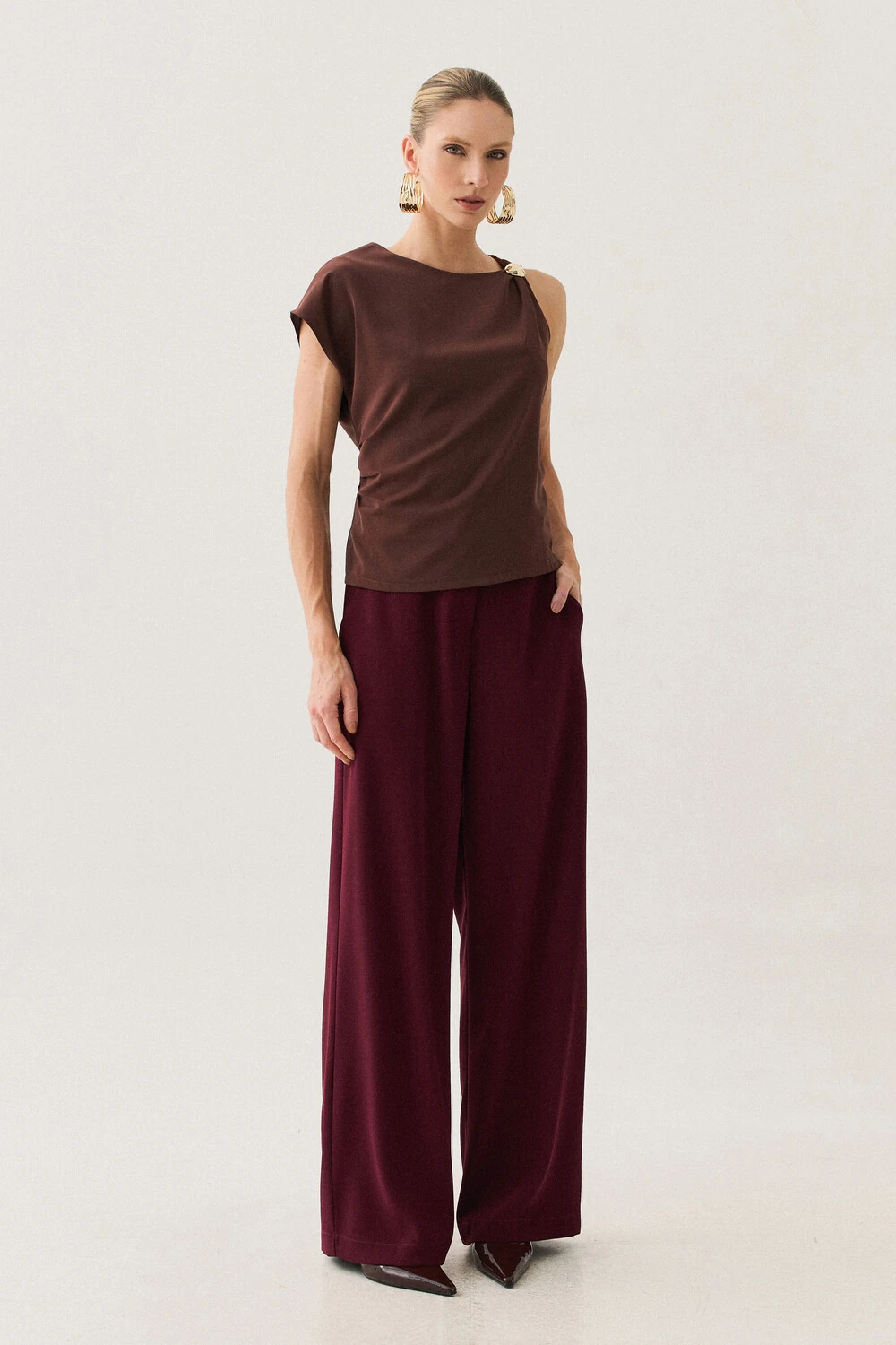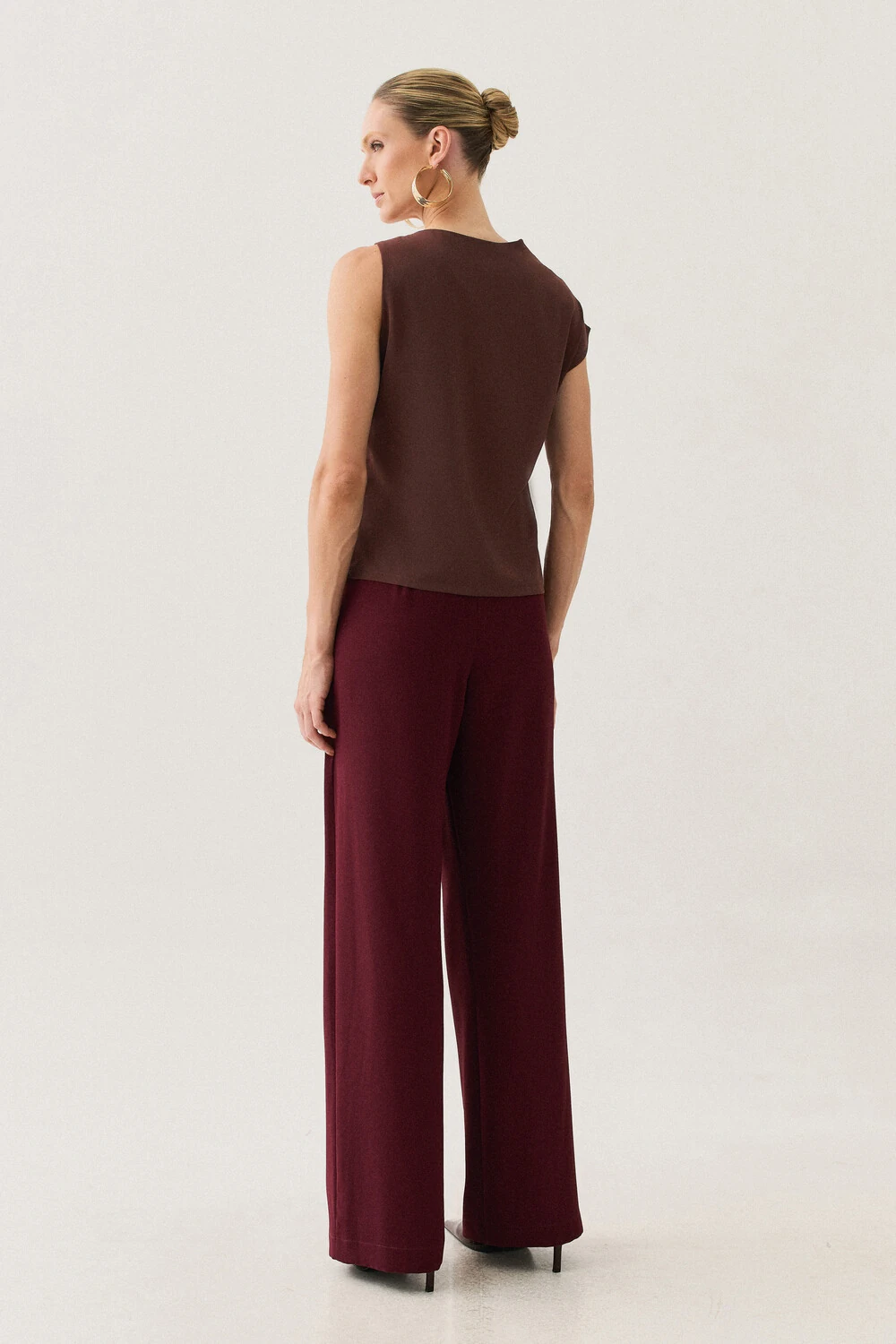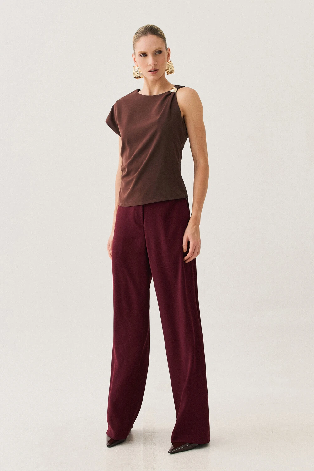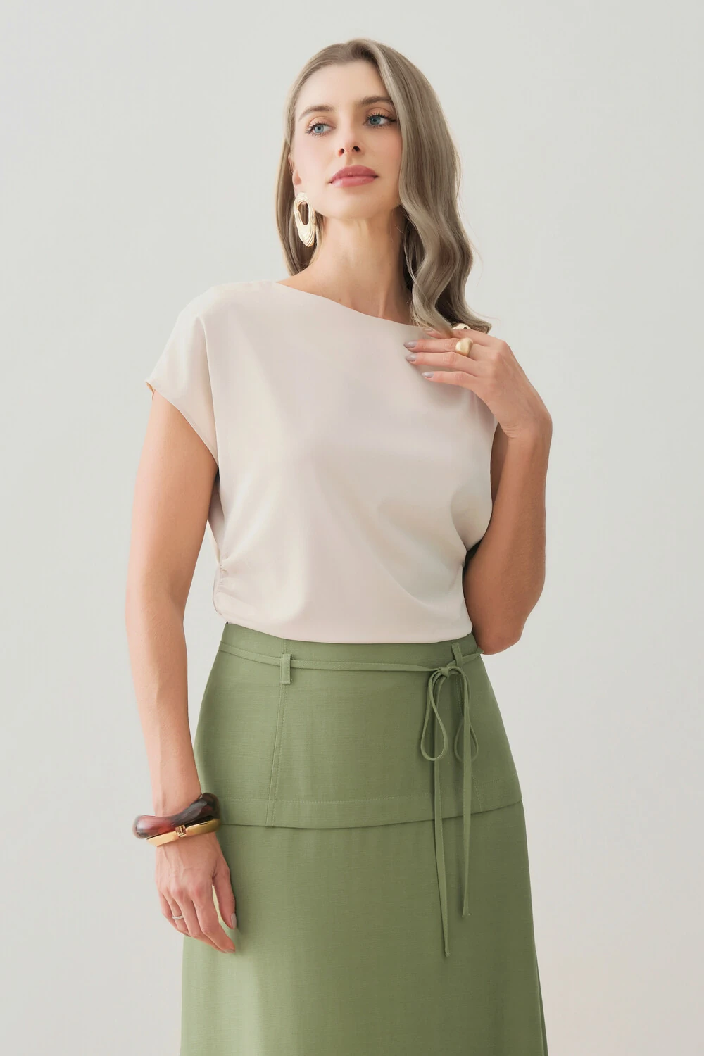 A modelagem sem mangas conta com ombro estendido de um lado, criando um efeito assimétrico sutil e contemporâneo, enquanto o franzido lateral valoriza o caimento com delicadeza.