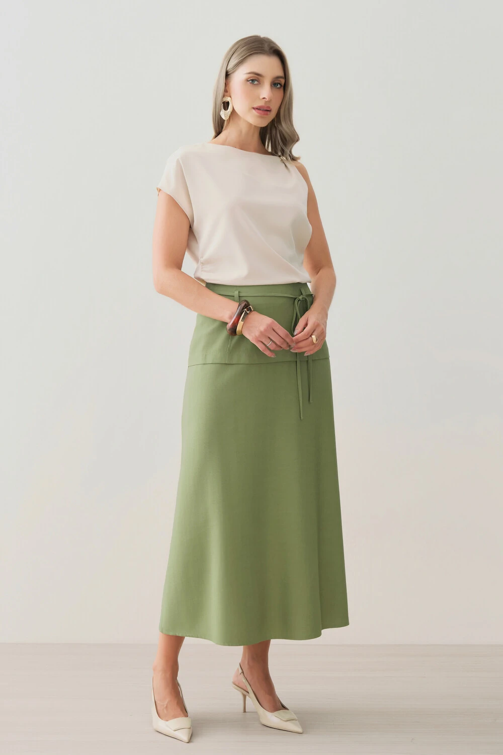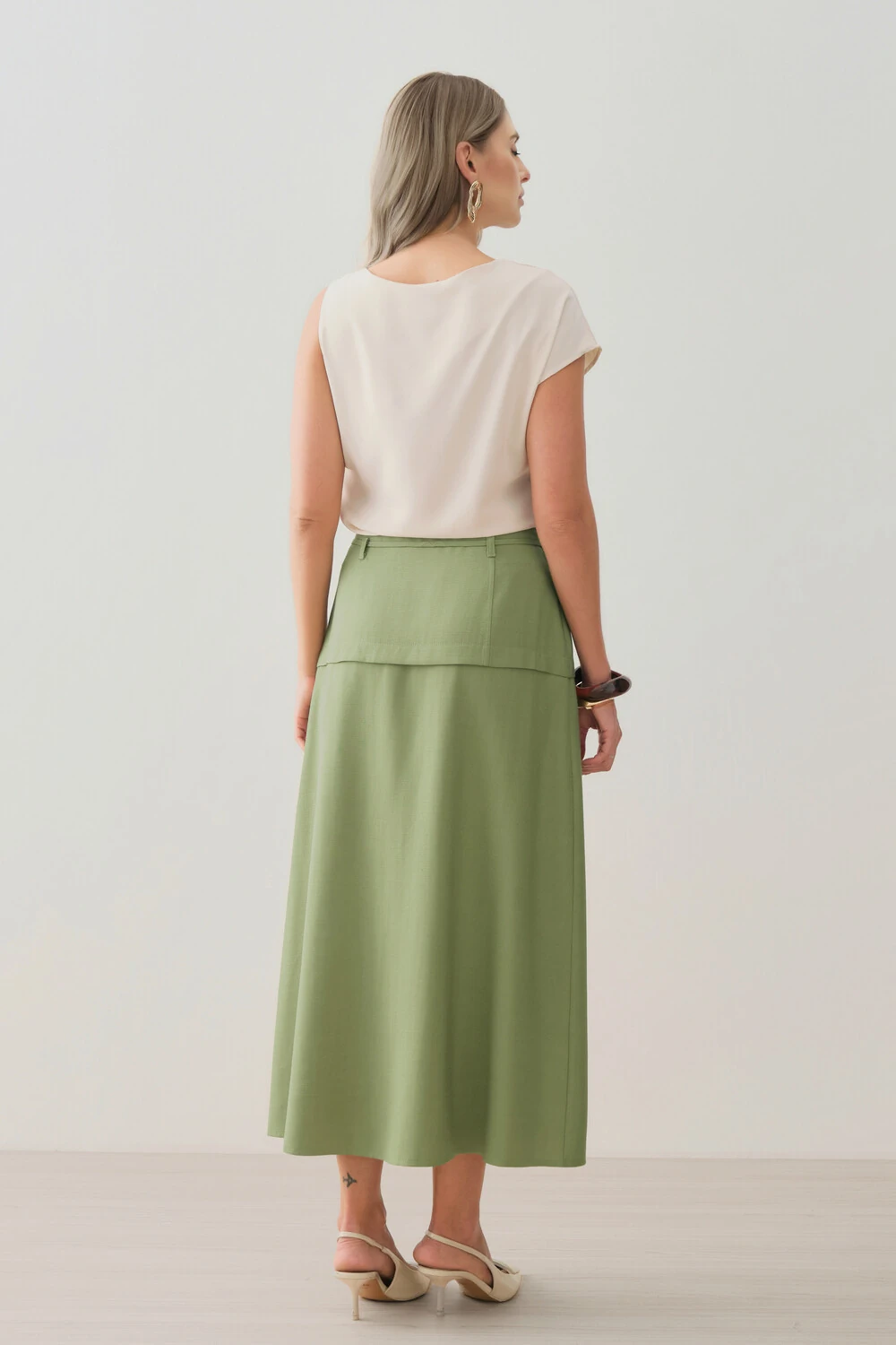 Tecido Dolce Vita Silk Look, com toque macio, levemente geladinho e superfície suavemente acetinada. Possui caimento fluido e brilho sutil, trazendo sofisticação e acabamento refinado à peça.