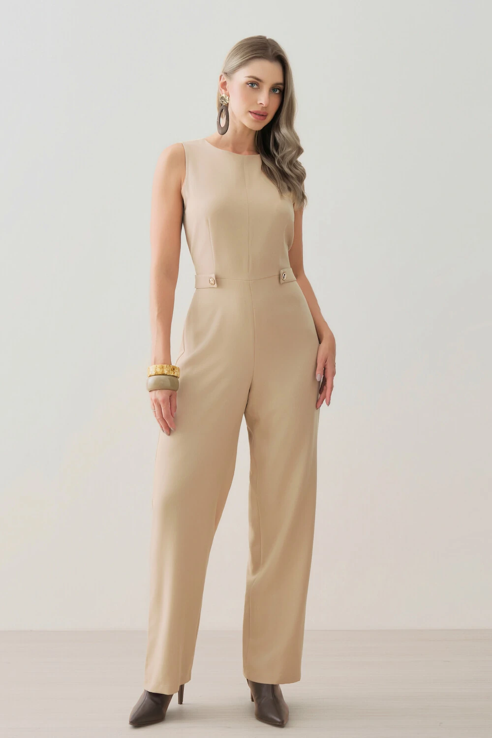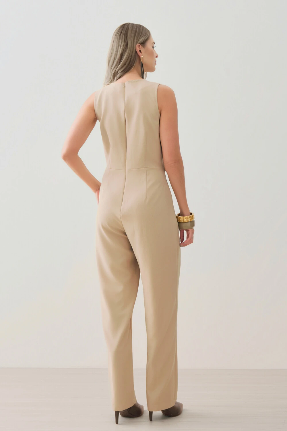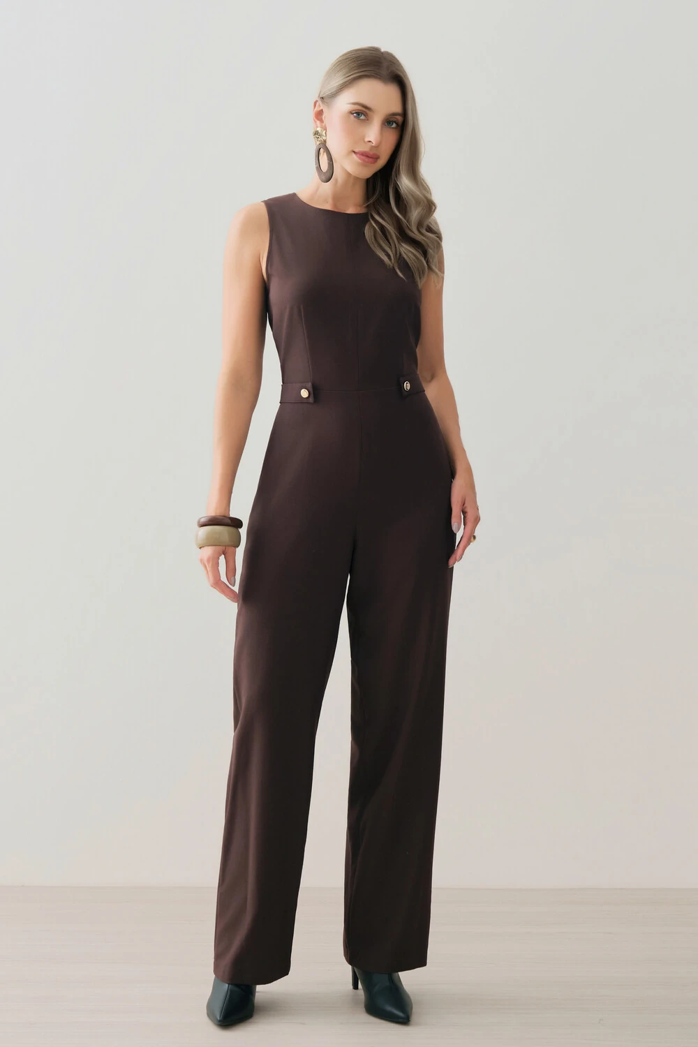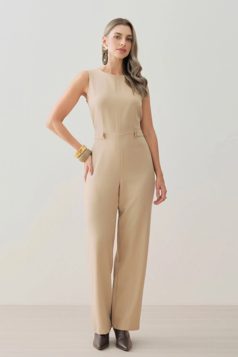 Macacão confeccionado em tecido de alfaiataria, com toque macio, caimento alinhado e visual elegante.
