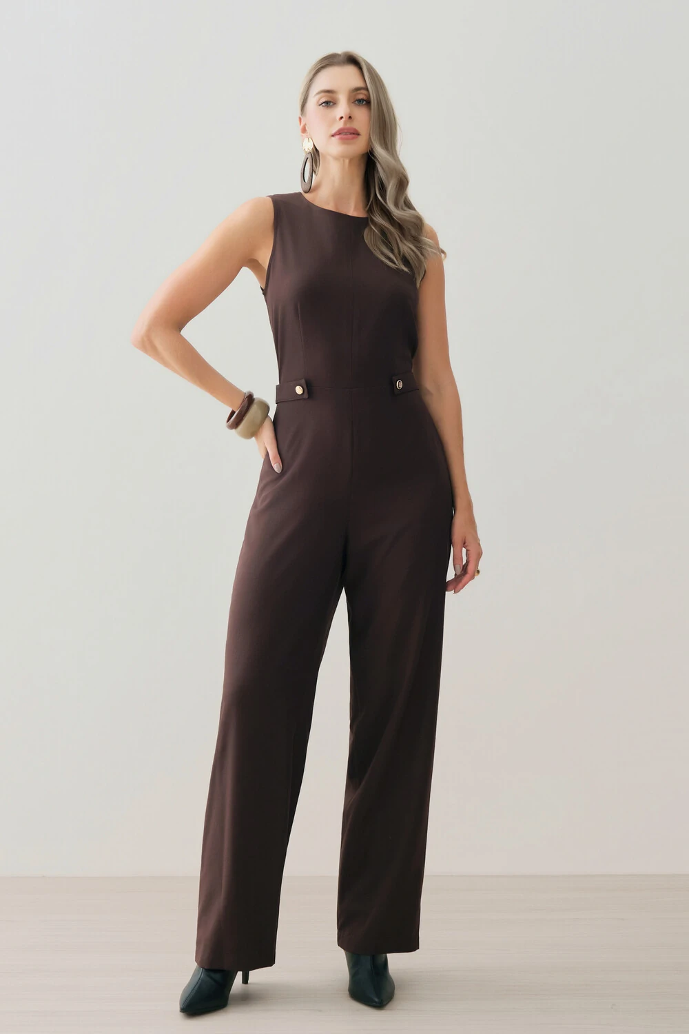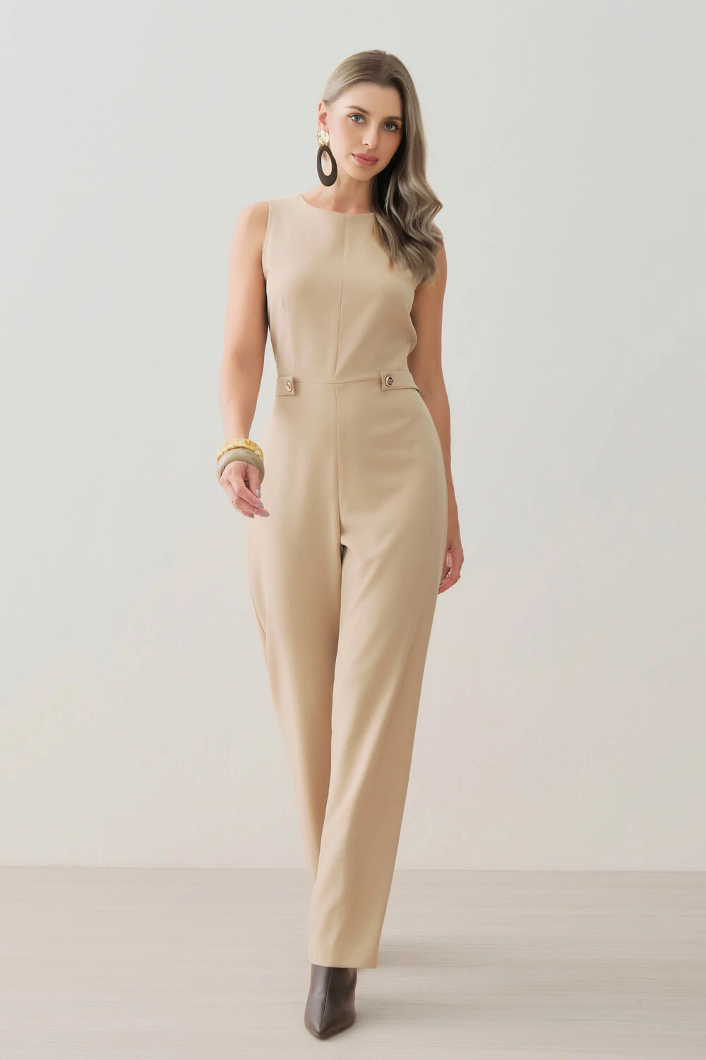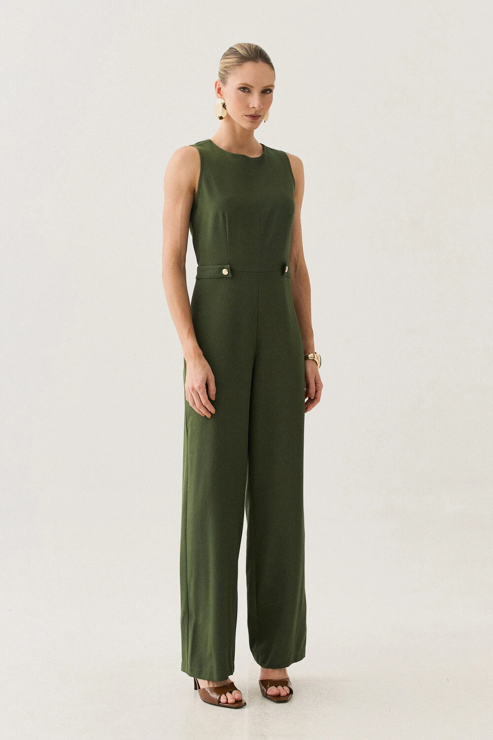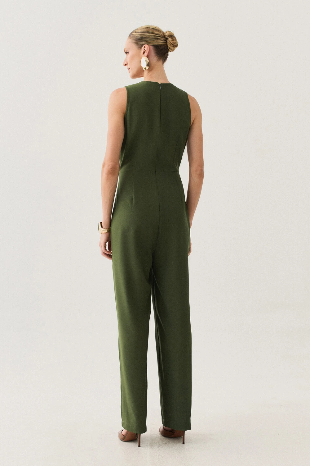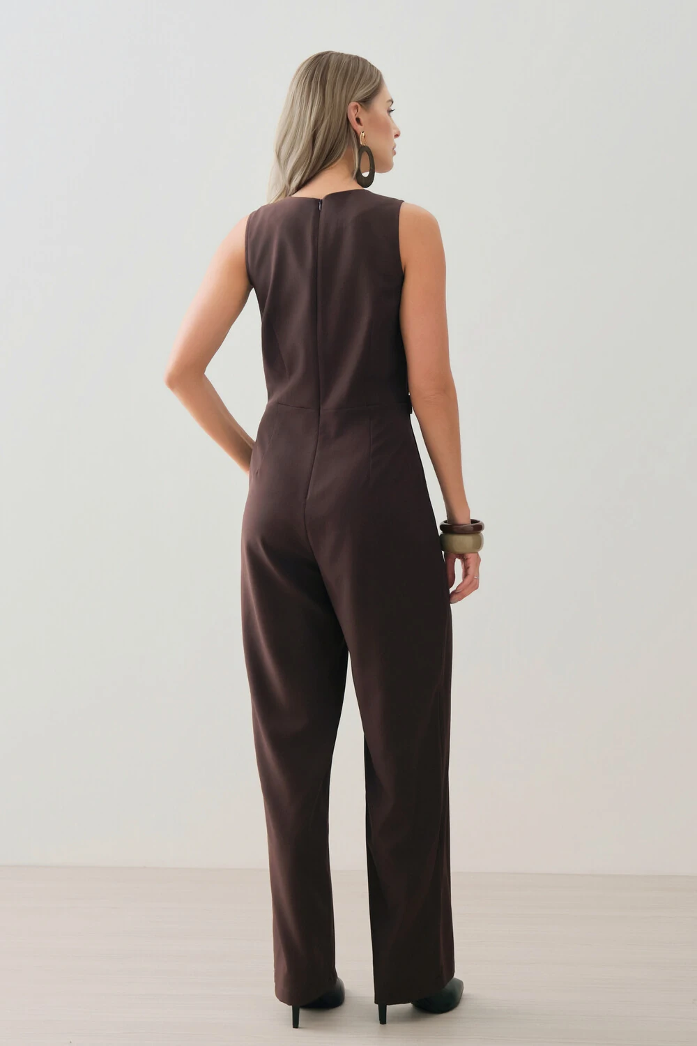 Macacão confeccionado em tecido de alfaiataria, com toque macio, caimento alinhado e visual elegante.