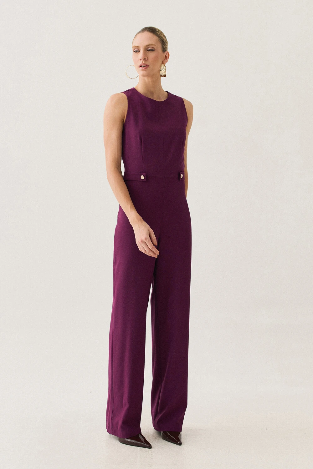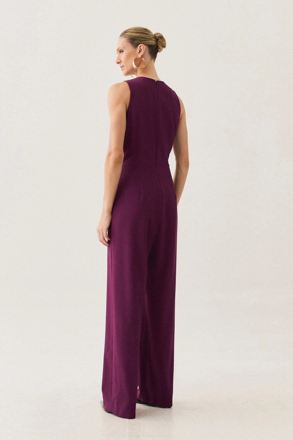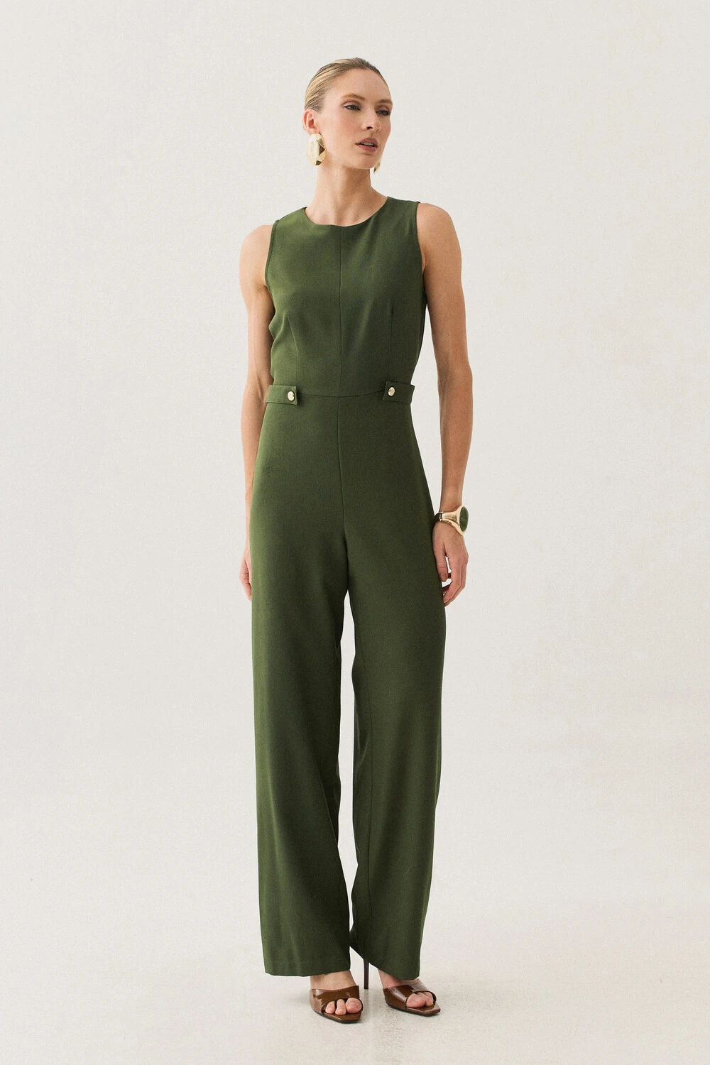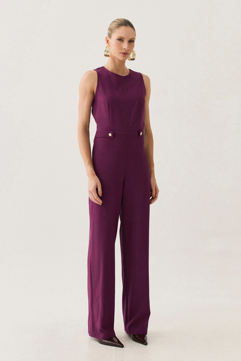 Macacão confeccionado em tecido de alfaiataria, com toque macio, caimento alinhado e visual elegante.