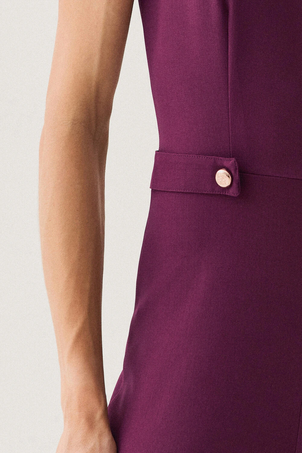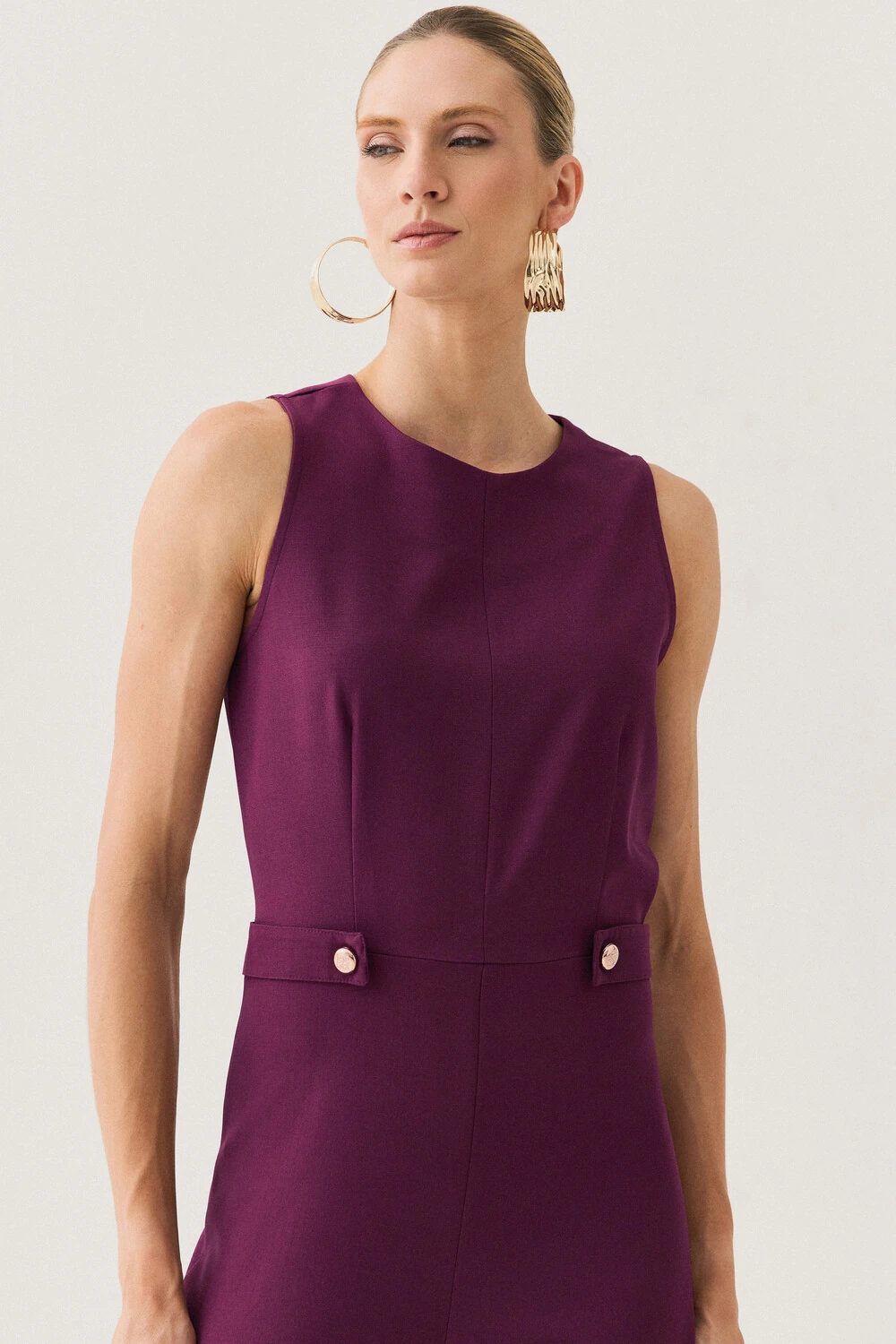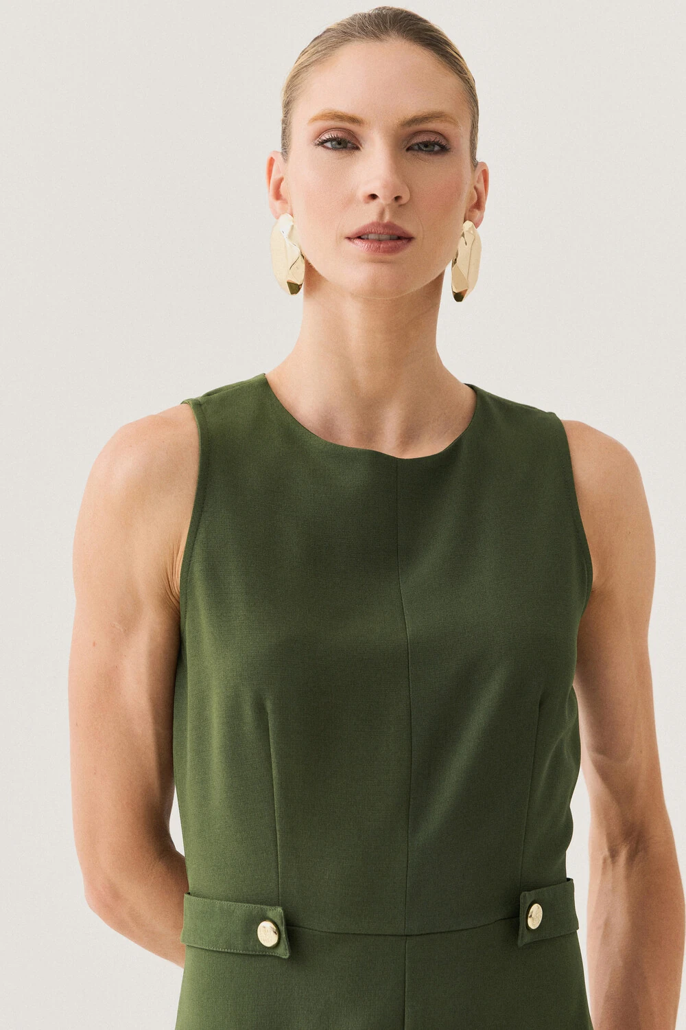 Possui decote redondo mais fechado e modelagem sem mangas, criando uma proposta sofisticada e atemporal.