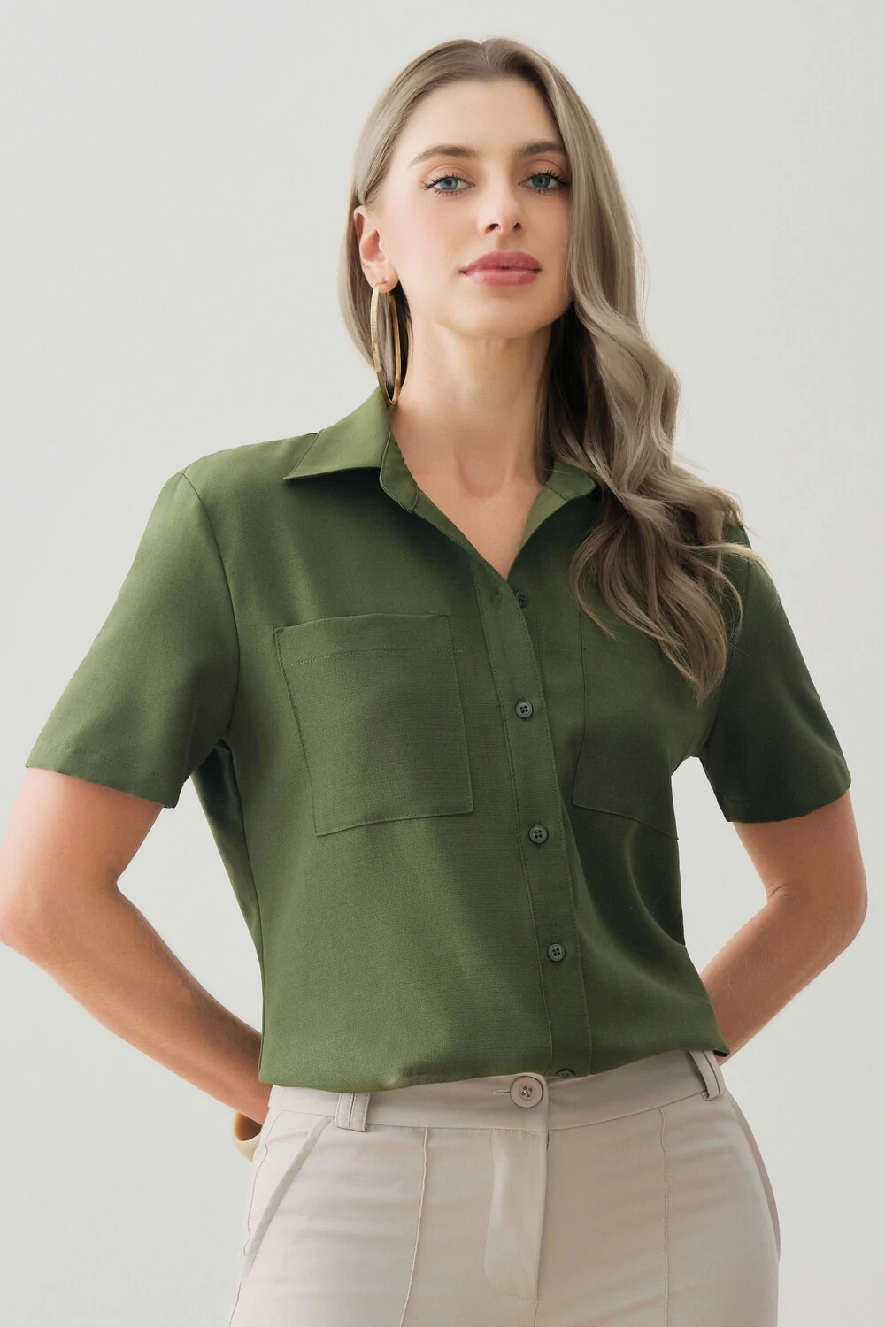 Possui gola clássica e fechamento frontal por botões, trazendo um acabamento atemporal e sofisticado.