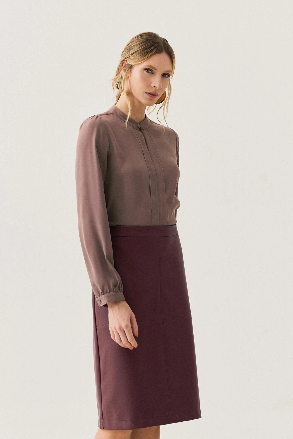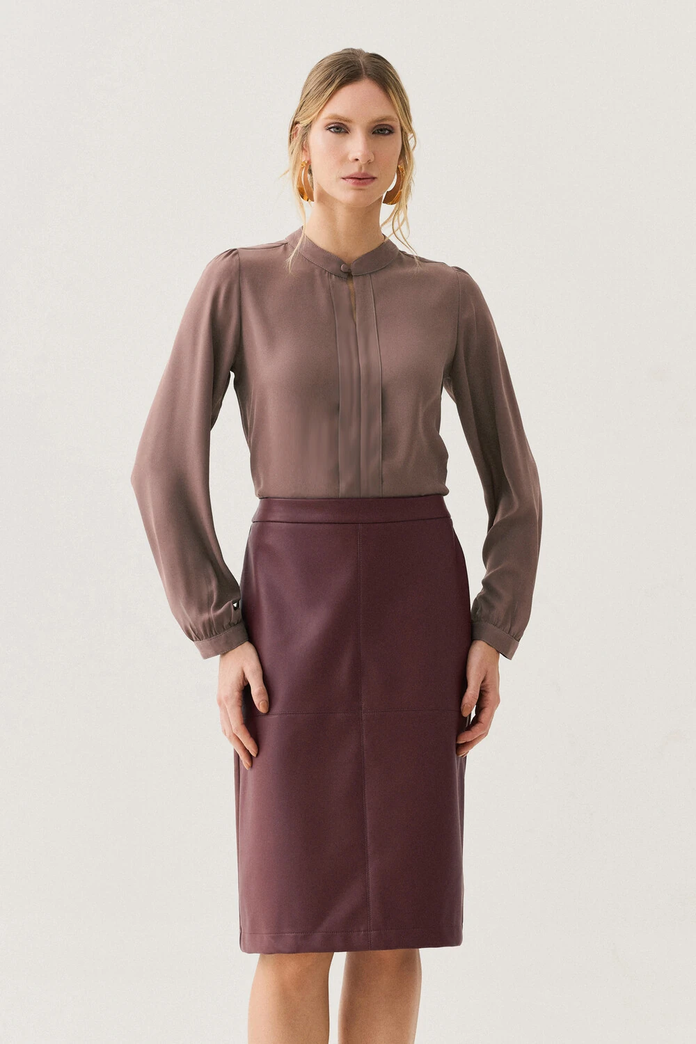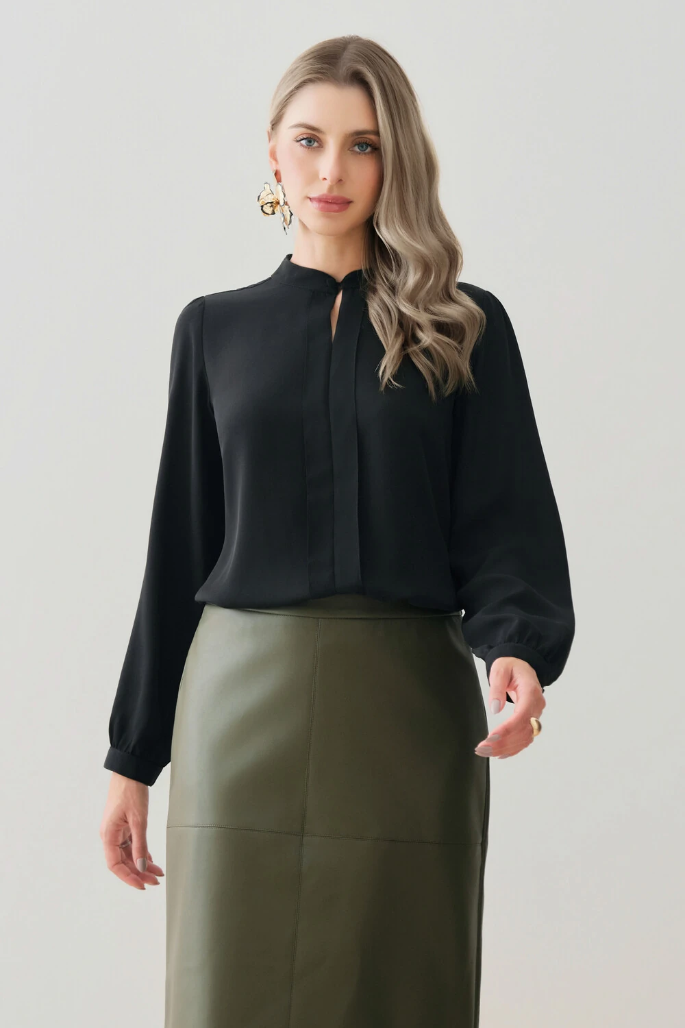 As mangas longas têm leve volume nos ombros e punhos ajustados, proporcionando feminilidade e elegância ao visual.