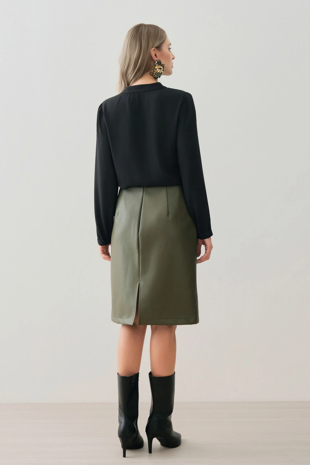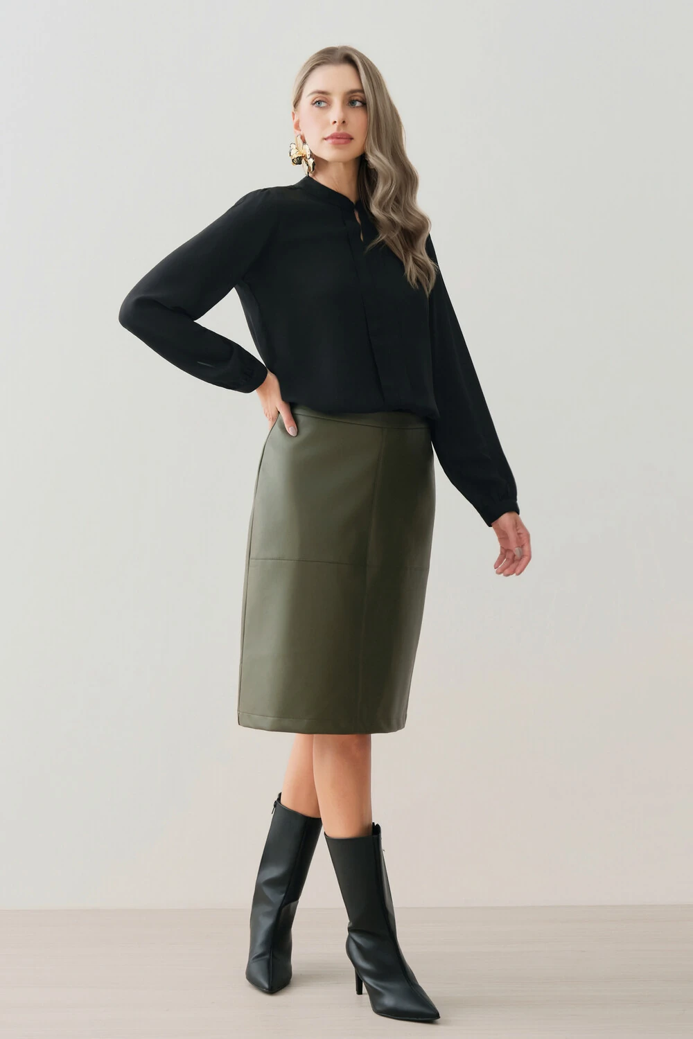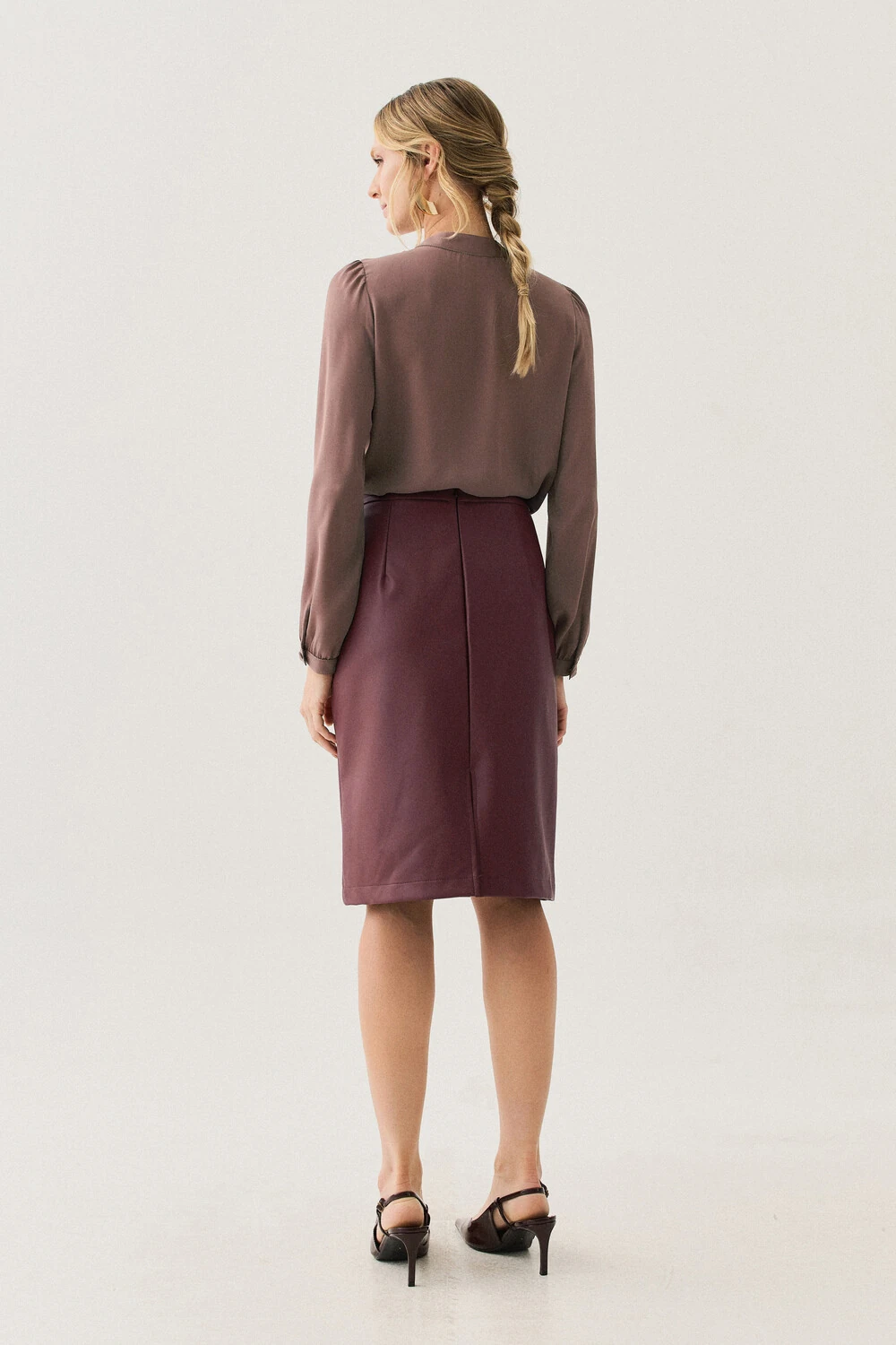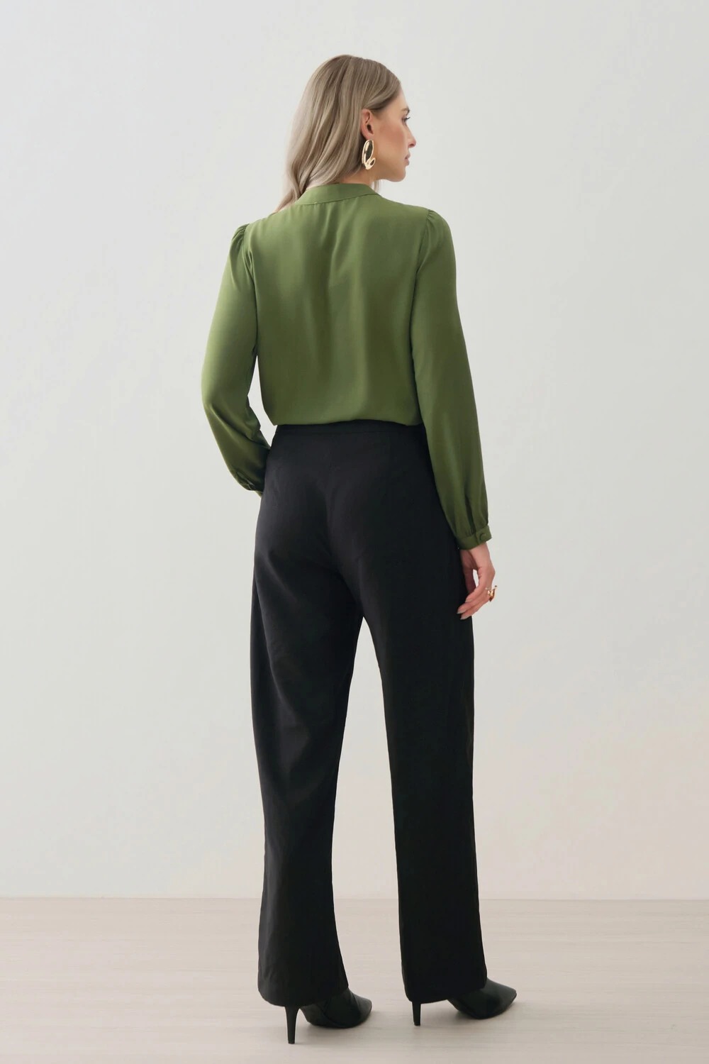 As mangas longas têm leve volume nos ombros e punhos ajustados, proporcionando feminilidade e elegância ao visual.