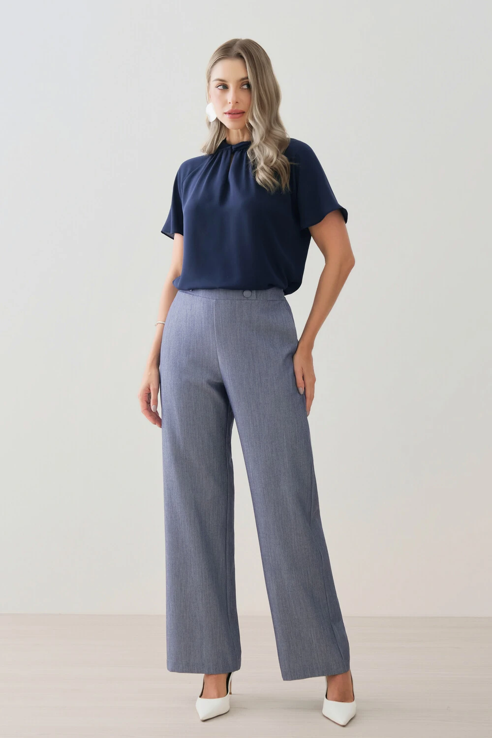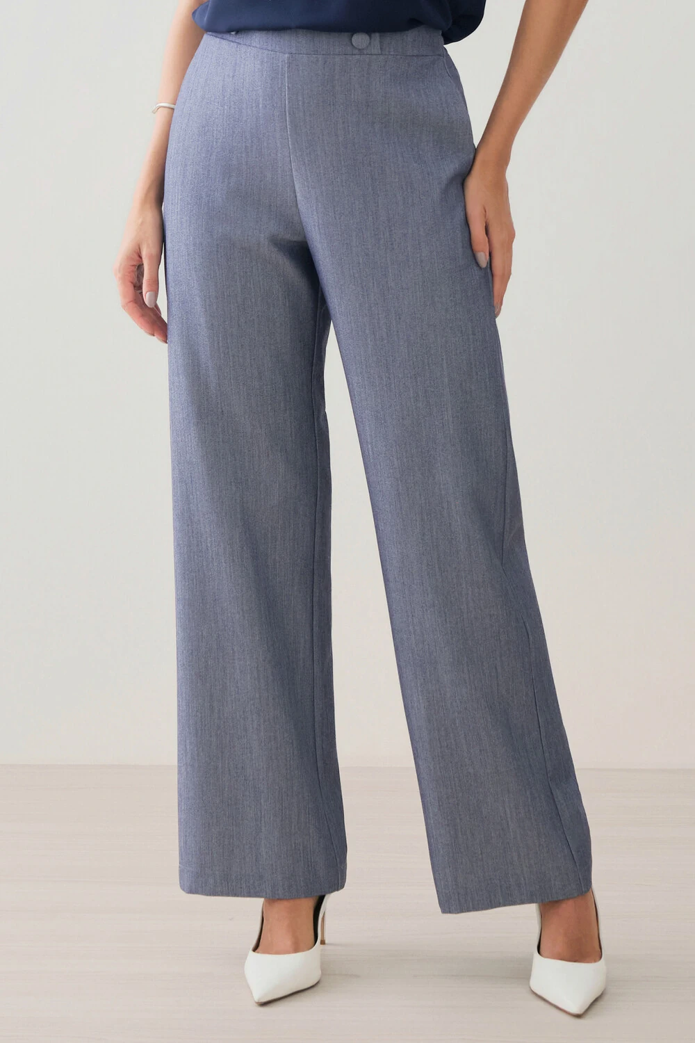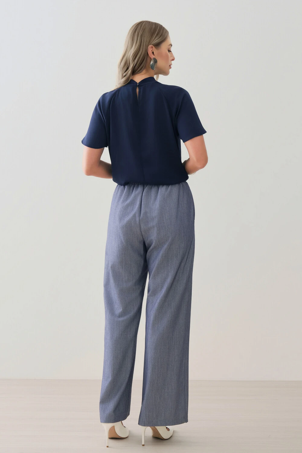 Possui cintura alta e modelagem pantalona, que alonga a silhueta e traz sofisticação ao visual.
