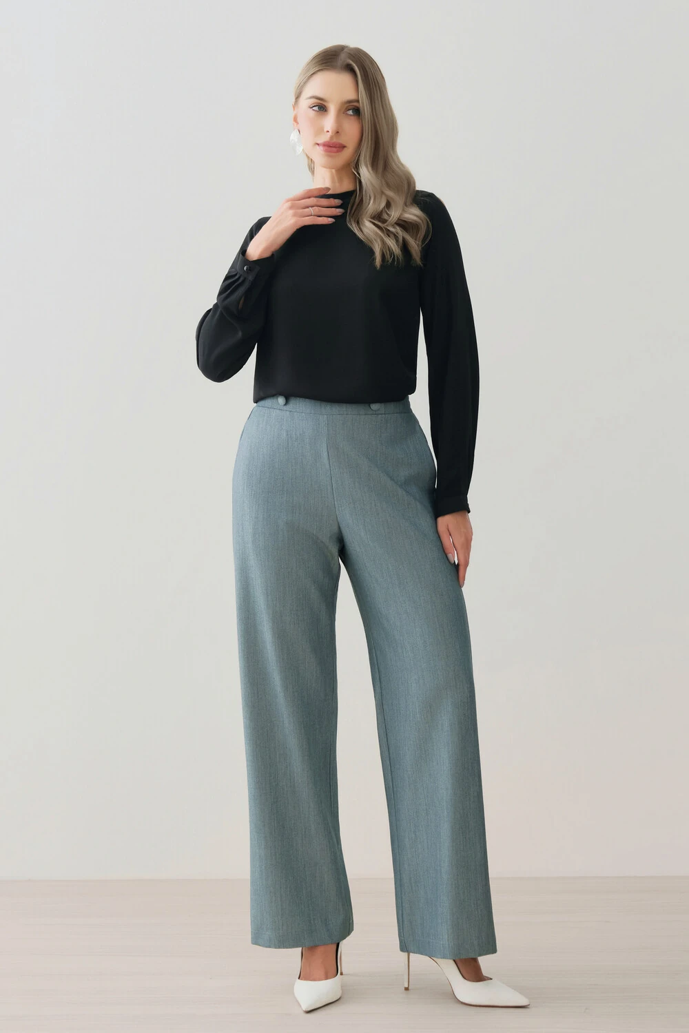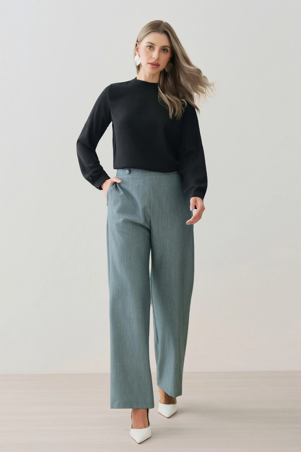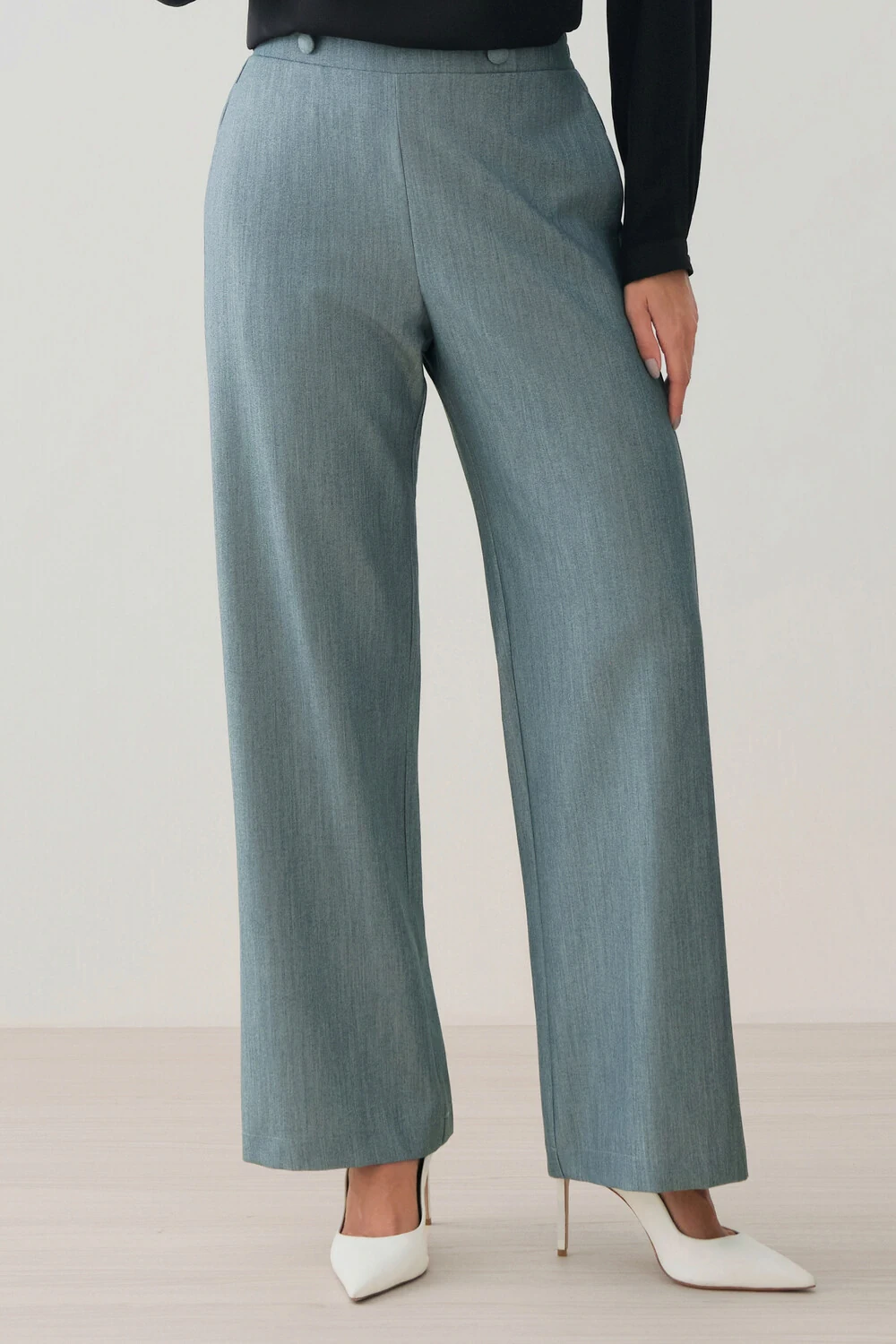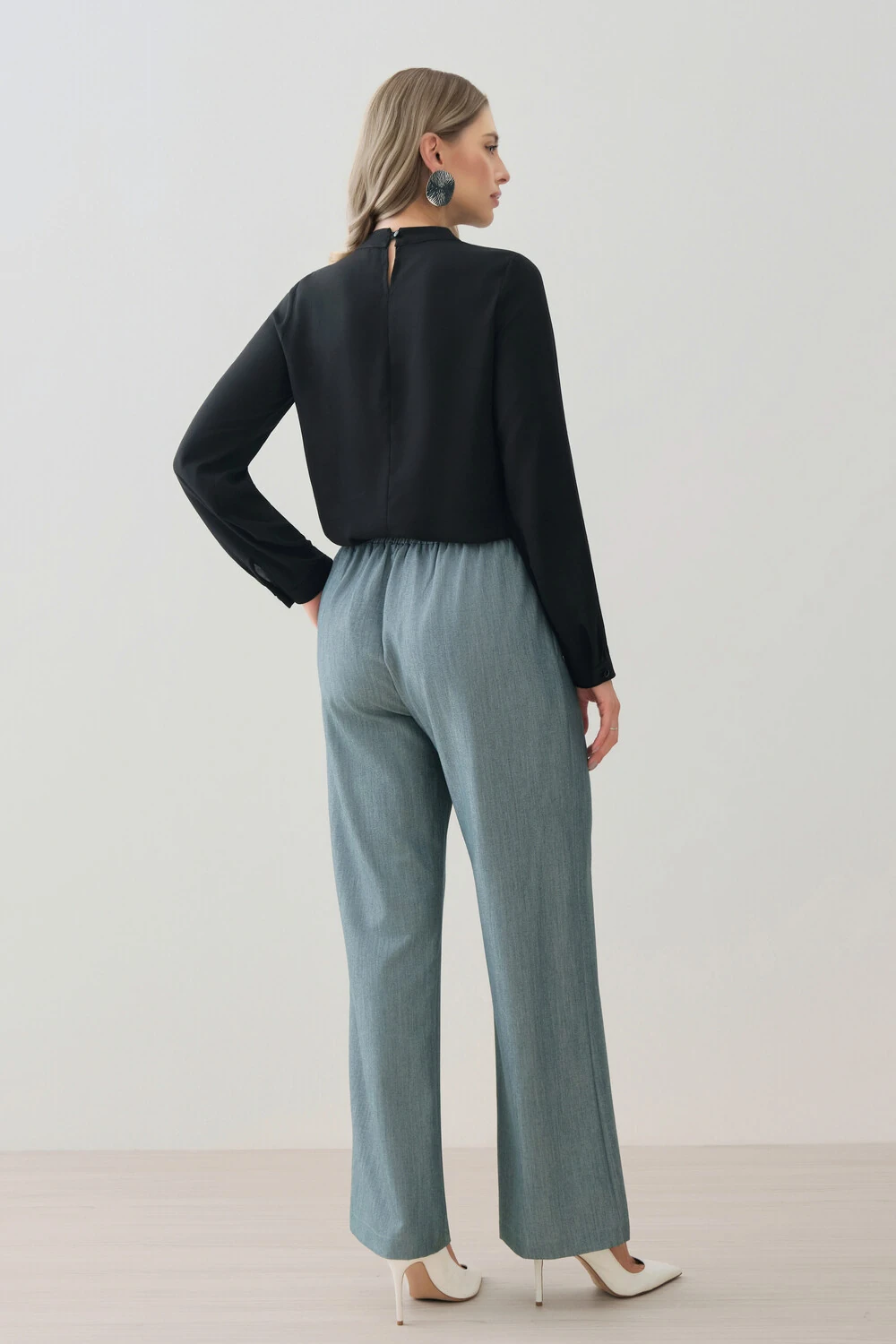 Possui cintura alta e modelagem pantalona, que alonga a silhueta e traz sofisticação ao visual.