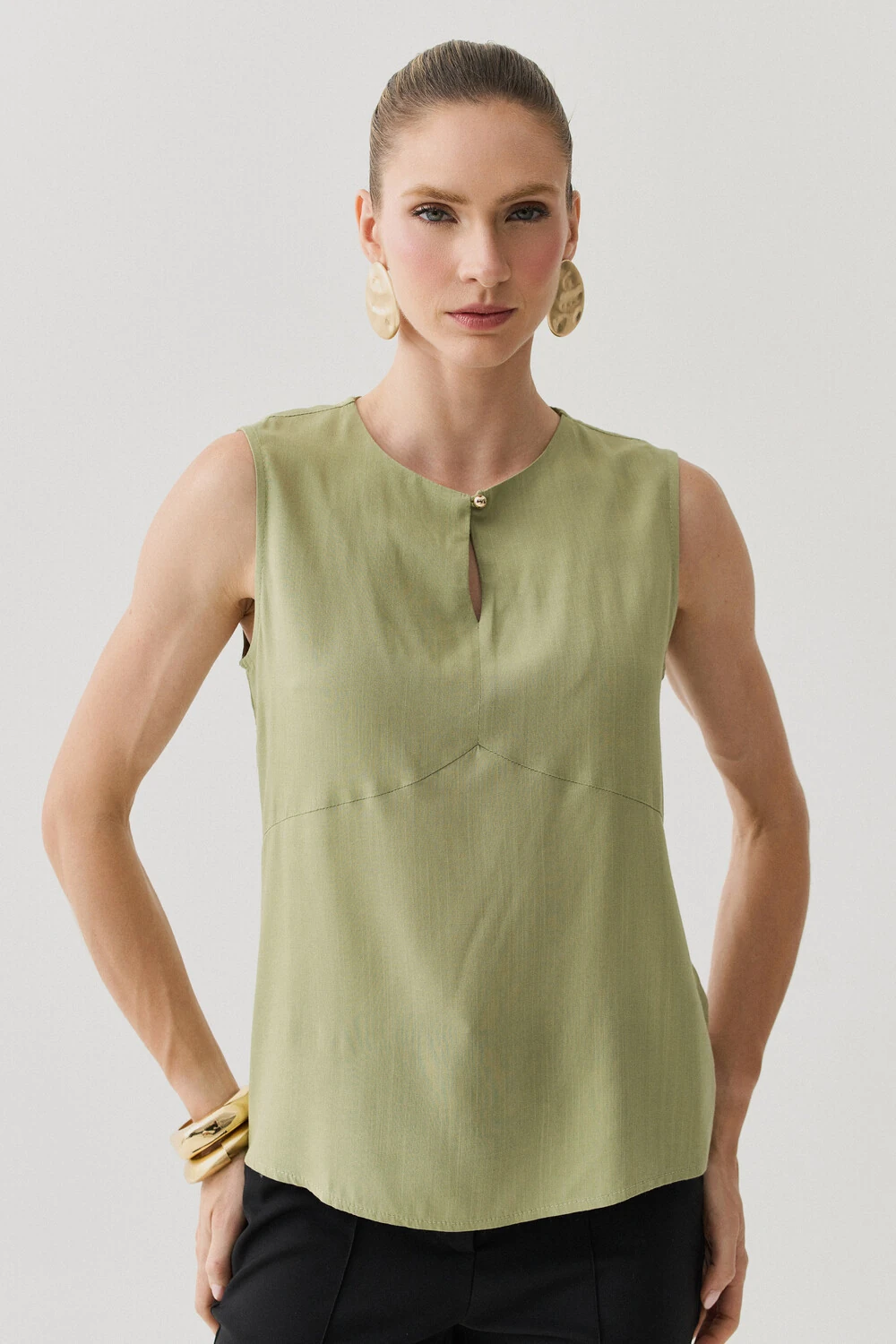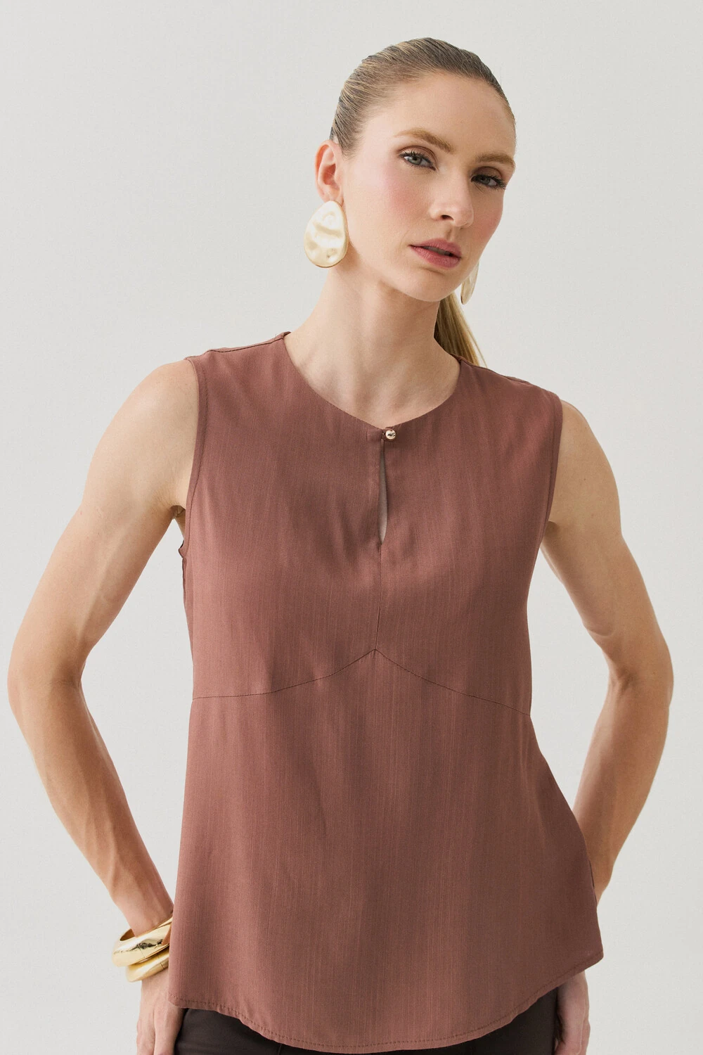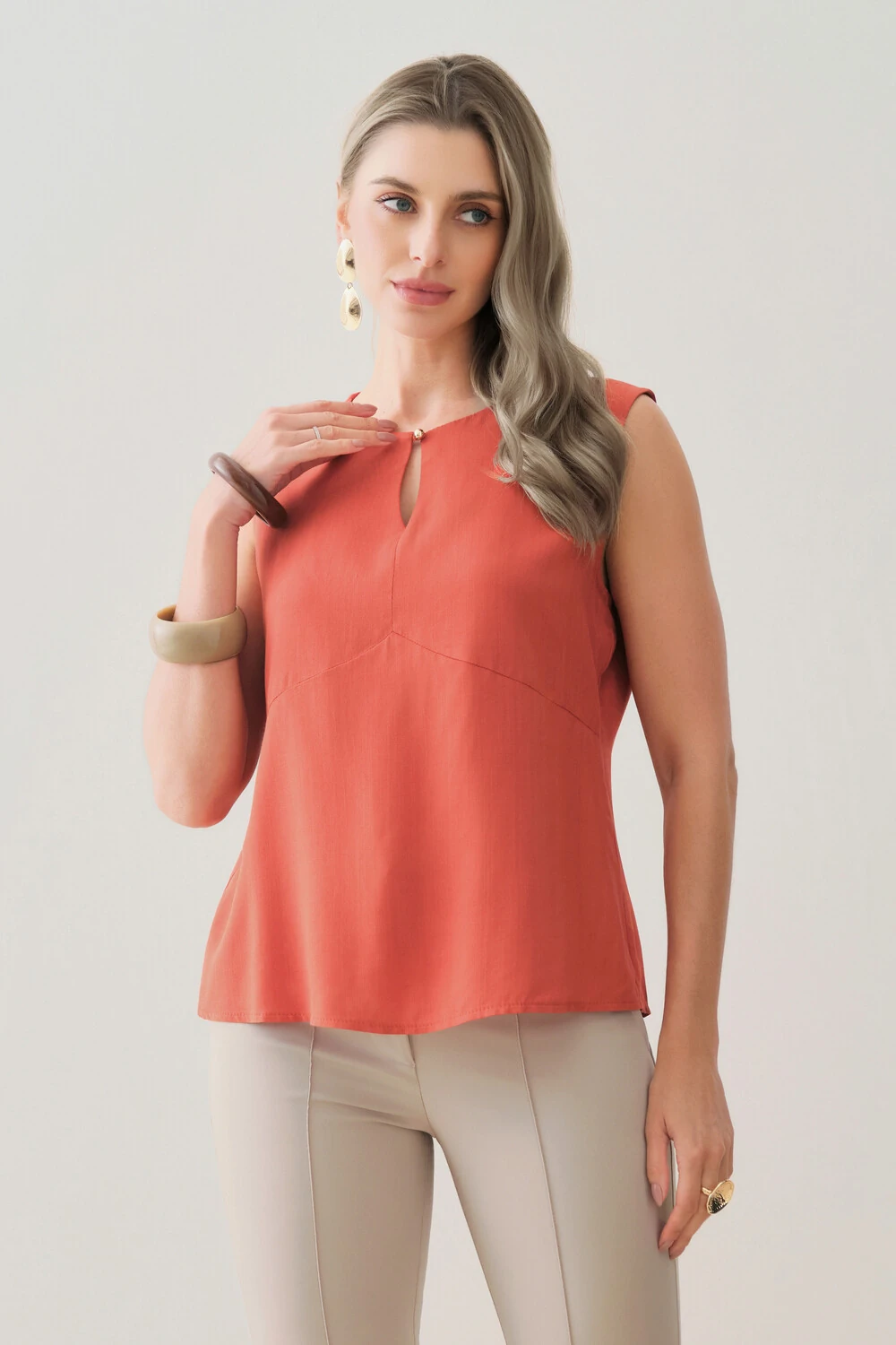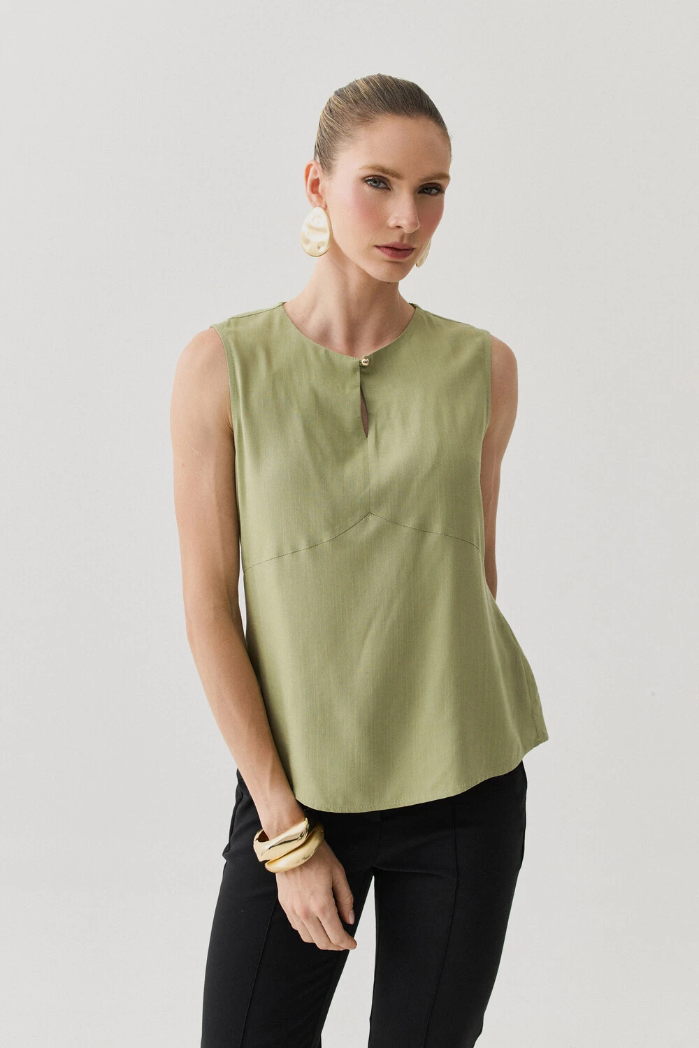 A modelagem sem mangas valoriza a proposta leve e versátil da peça, enquanto o recorte frontal acrescenta um detalhe discreto e refinado ao visual.