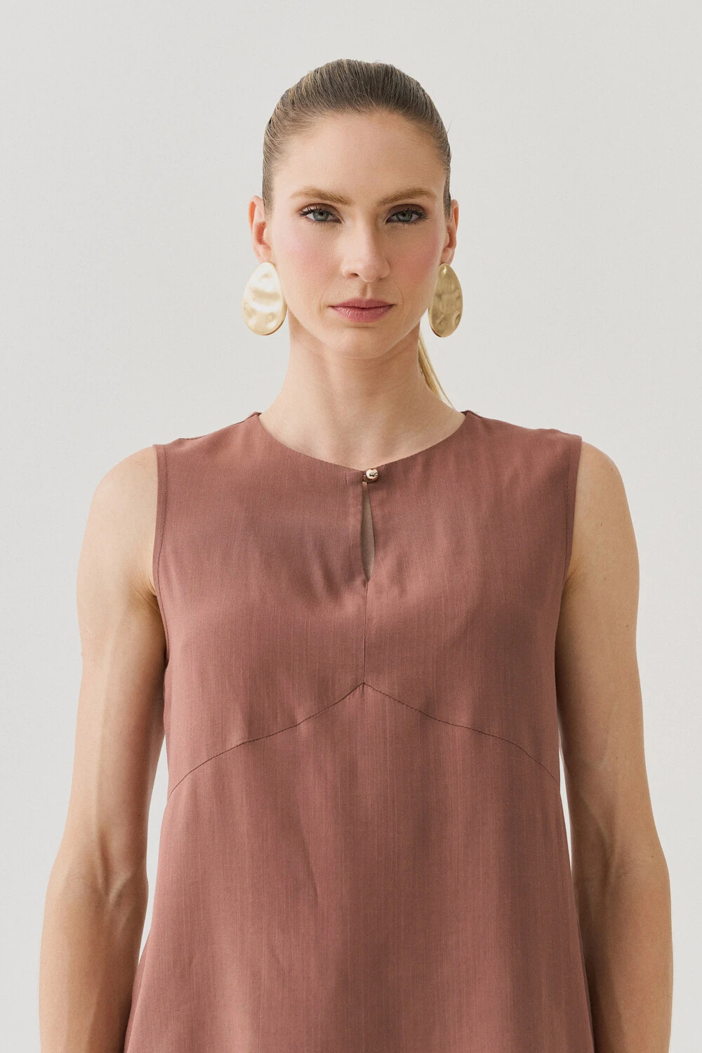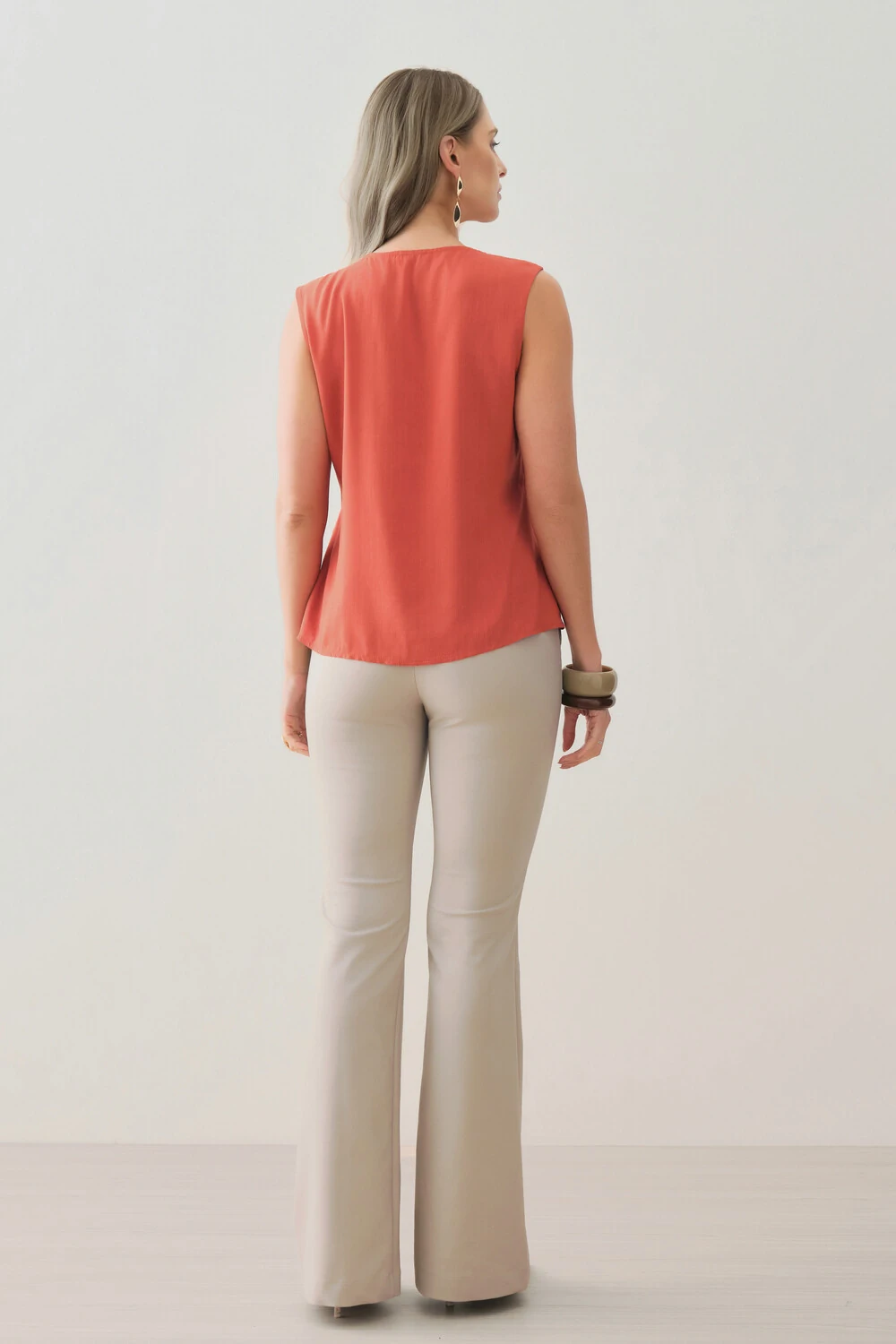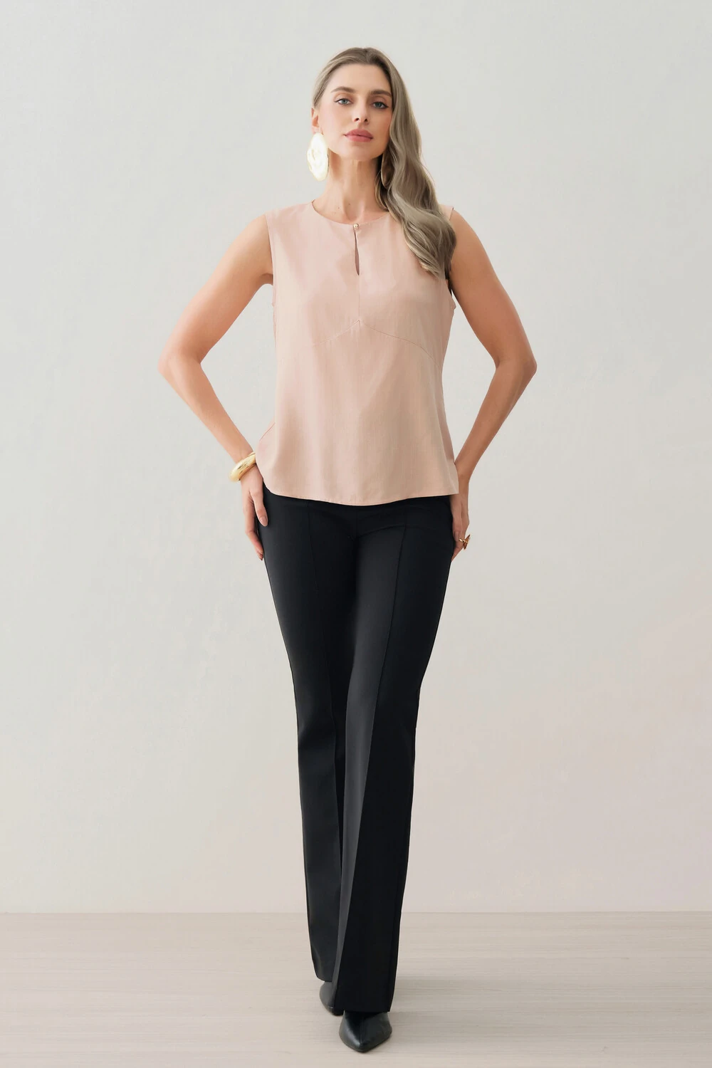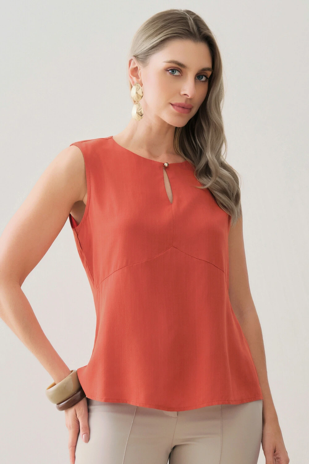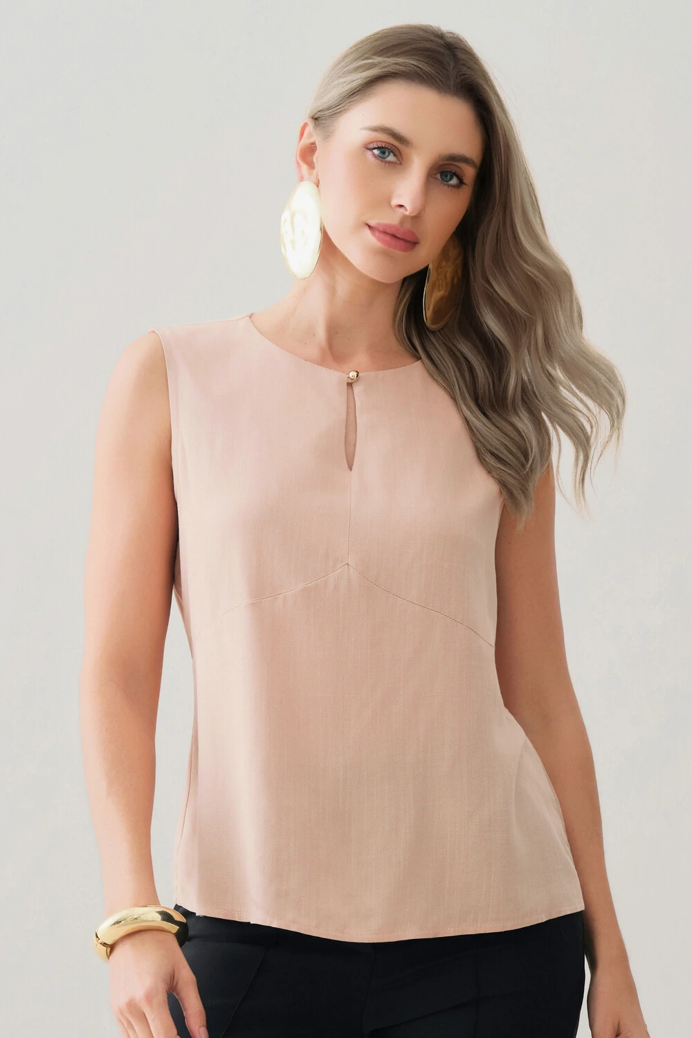 A modelagem sem mangas valoriza a proposta leve e versátil da peça, enquanto o recorte frontal acrescenta um detalhe discreto e refinado ao visual.