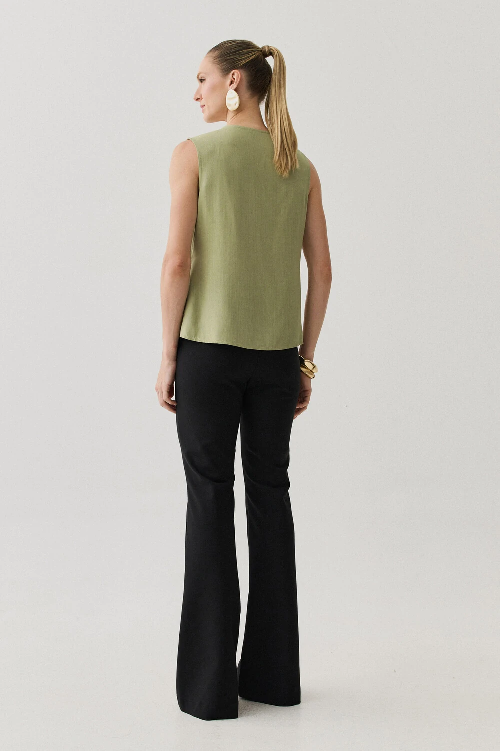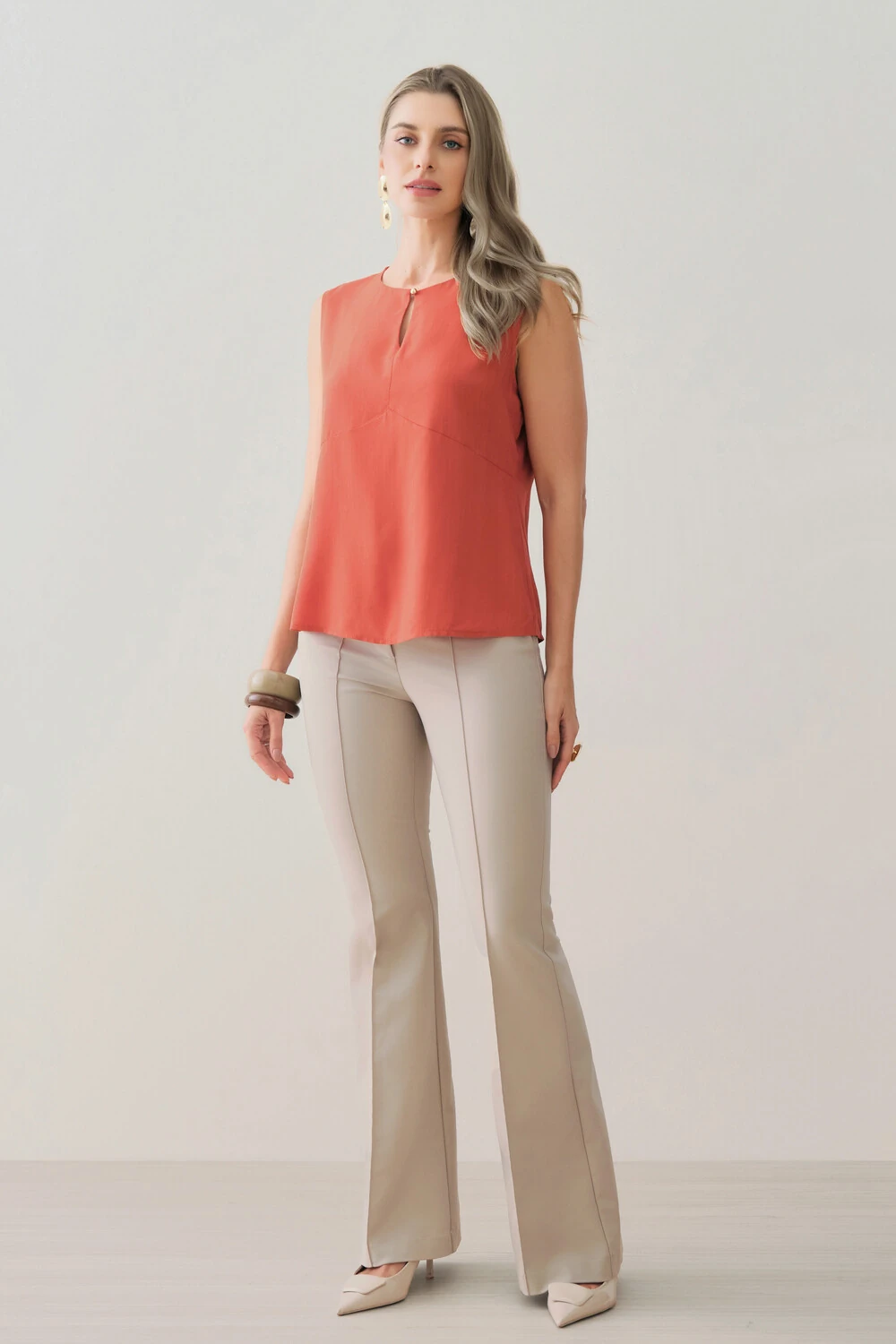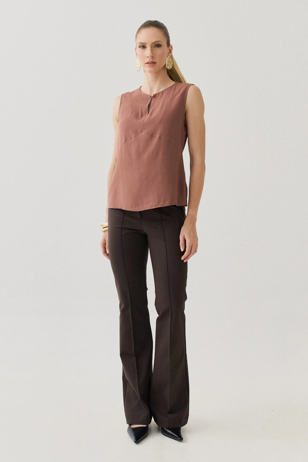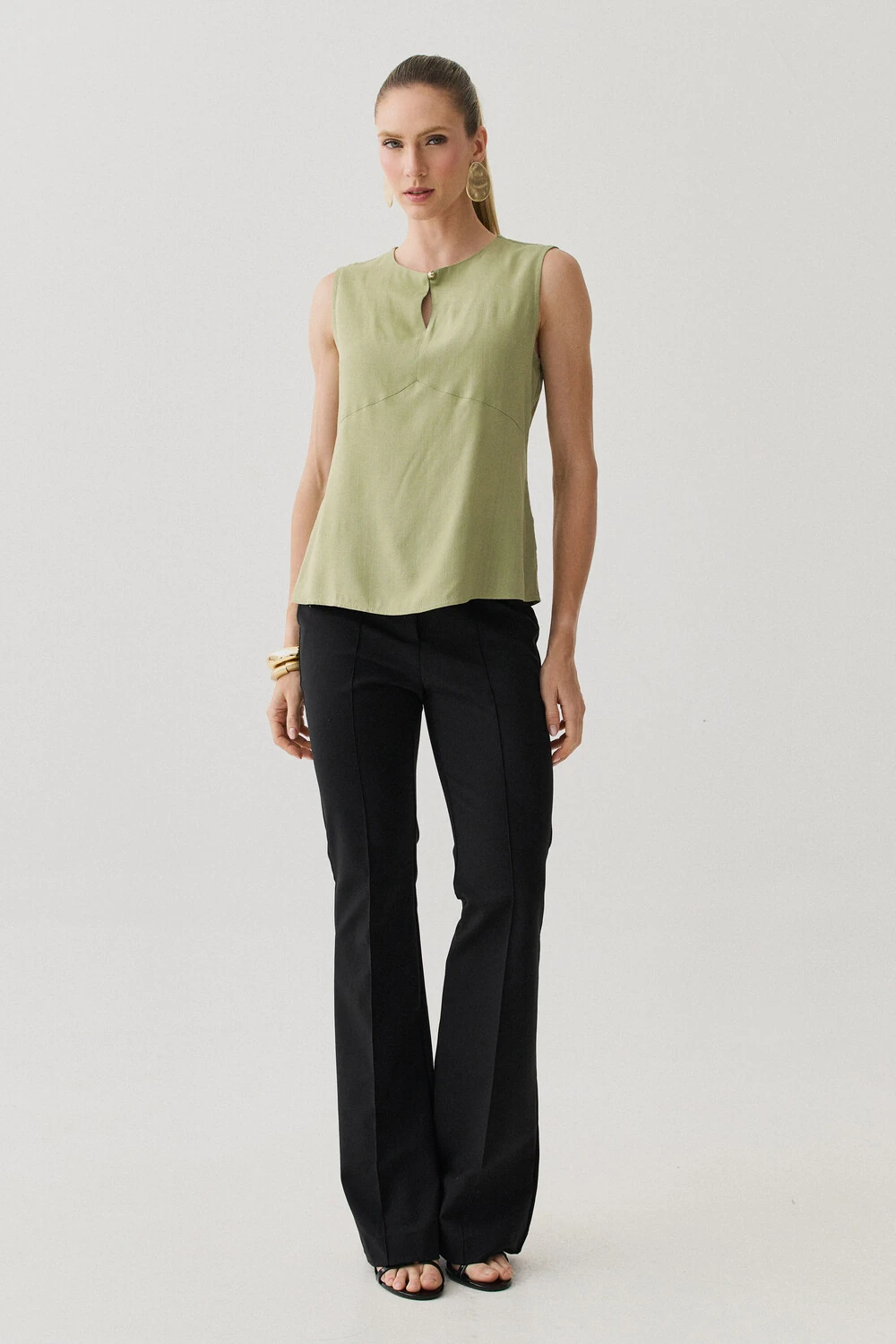 A modelagem sem mangas valoriza a proposta leve e versátil da peça, enquanto o recorte frontal acrescenta um detalhe discreto e refinado ao visual.