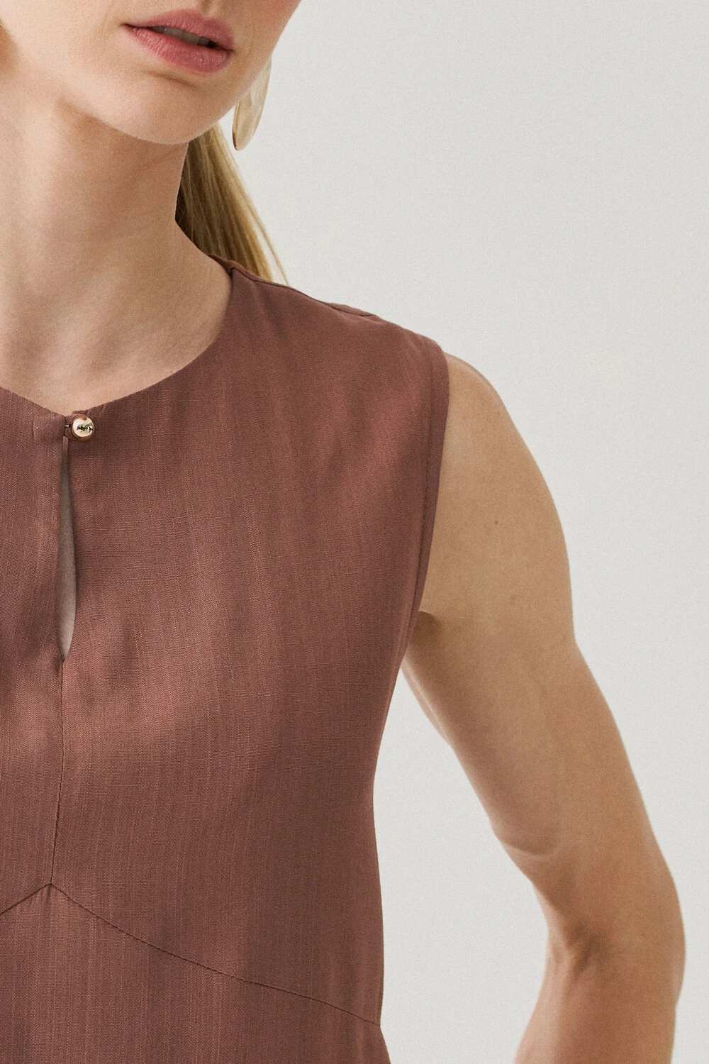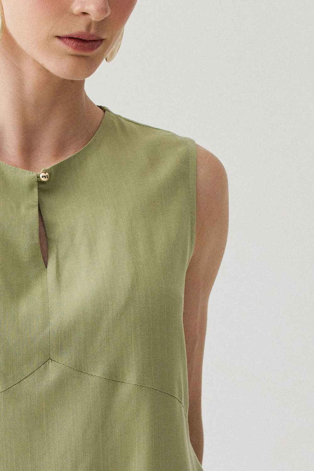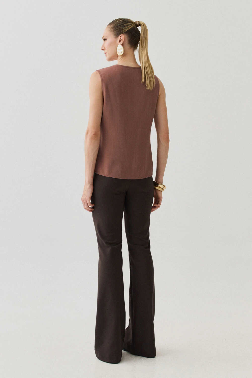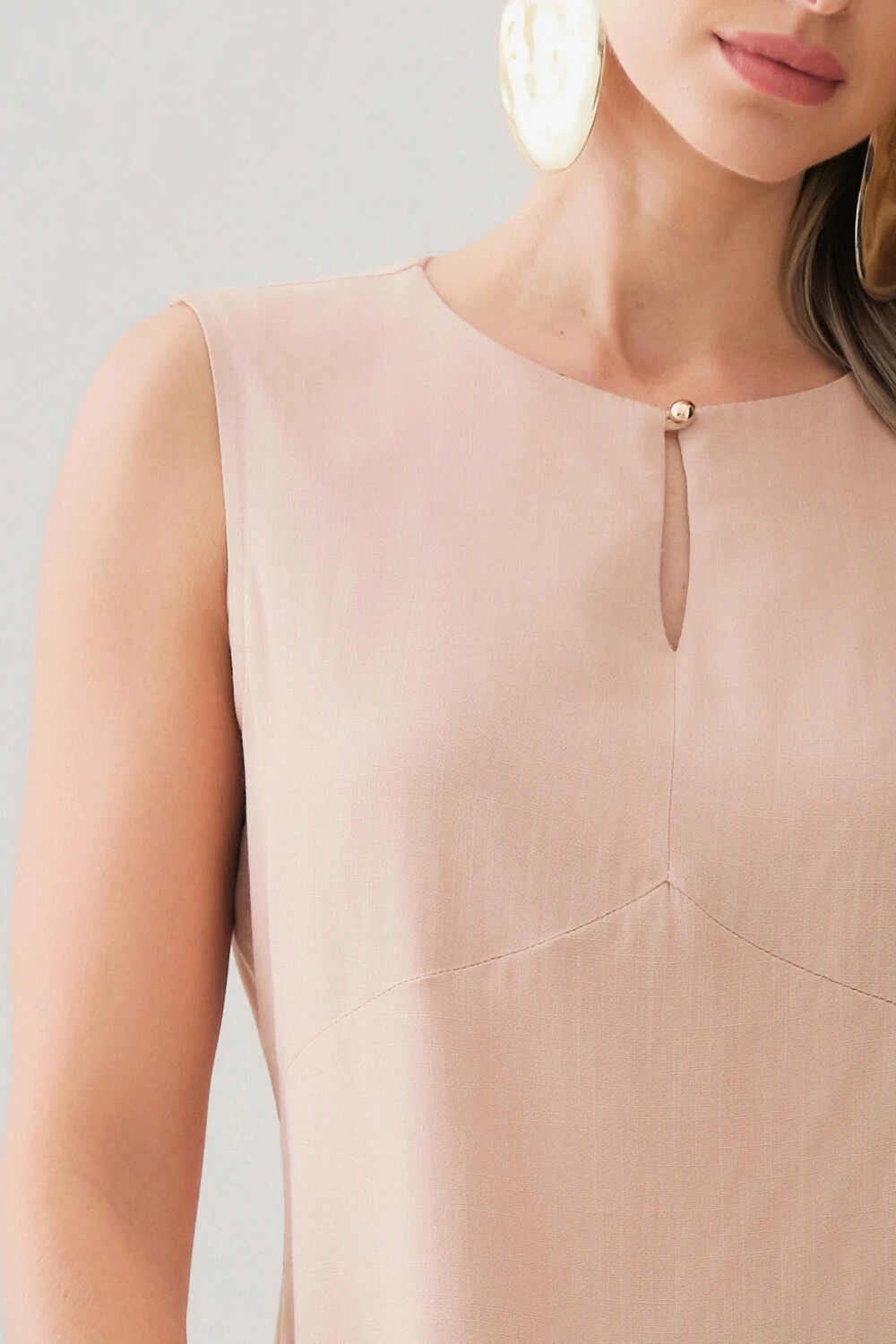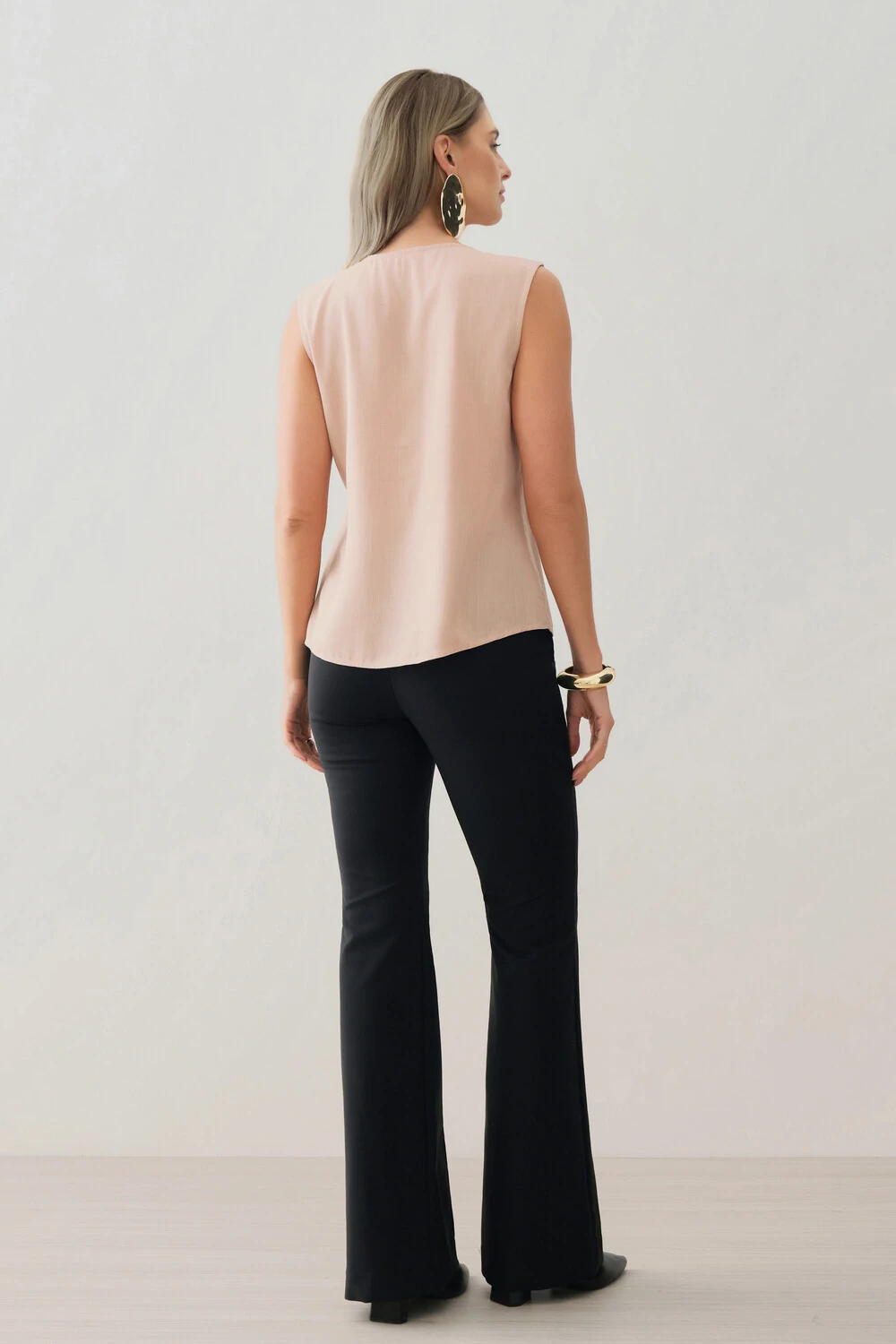 A modelagem sem mangas valoriza a proposta leve e versátil da peça, enquanto o recorte frontal acrescenta um detalhe discreto e refinado ao visual.