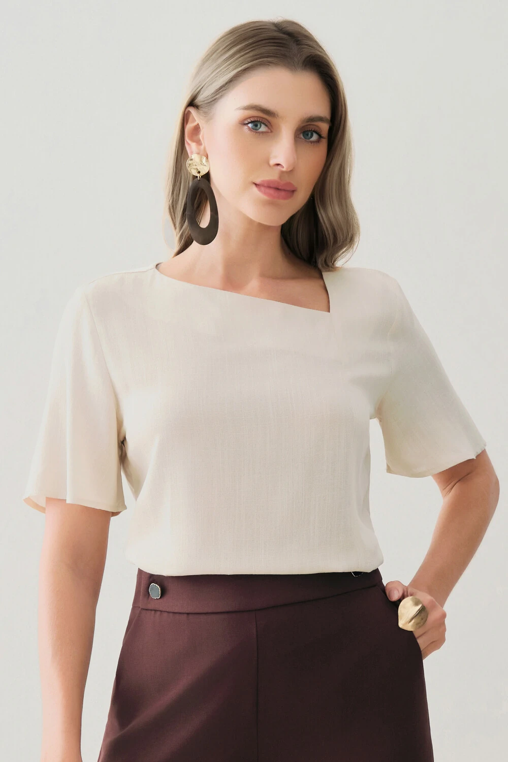 Possui decote v assimétrico, que valoriza o colo com um detalhe moderno e refinado.