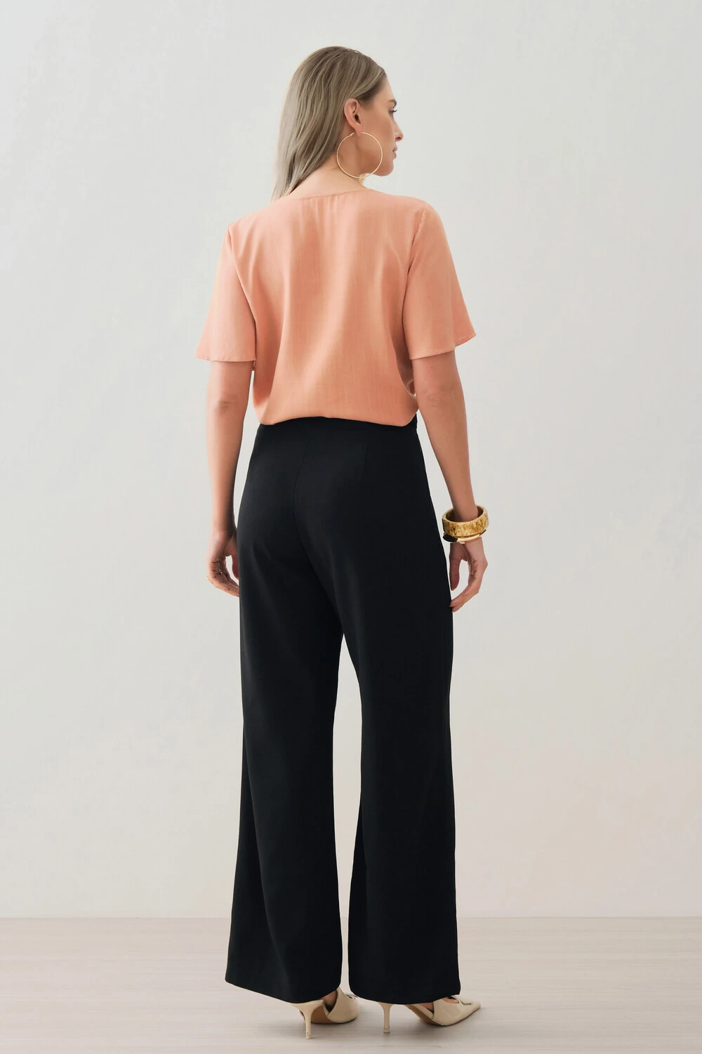 Conta com recorte frontal, que acrescenta informação de design e reforça a proposta elegante da peça.