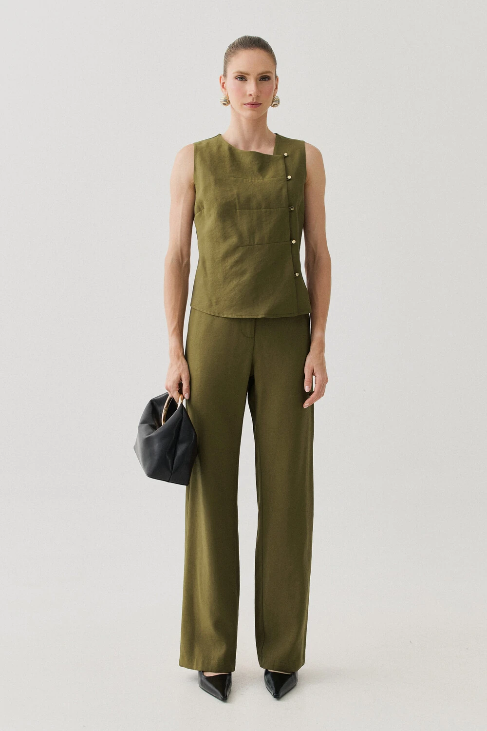 A blusa possui decote assimétrico, que valoriza o colo com modernidade, e modelagem sem mangas, ideal para propostas refinadas e versáteis. Como detalhe, conta com mini botões dourados aplicados na parte frontal, que acrescentam charme e acabamento sofisticado à peça. A modelagem conta ainda com pences, que ajudam no melhor caimento ao vestir e valorizam a silhueta de forma delicada.