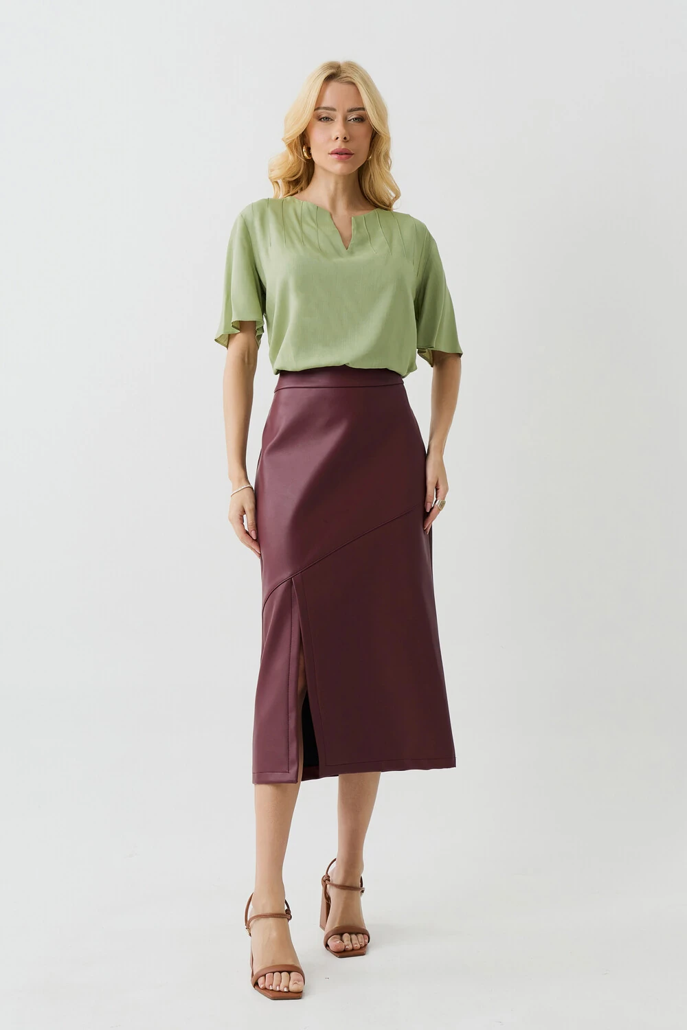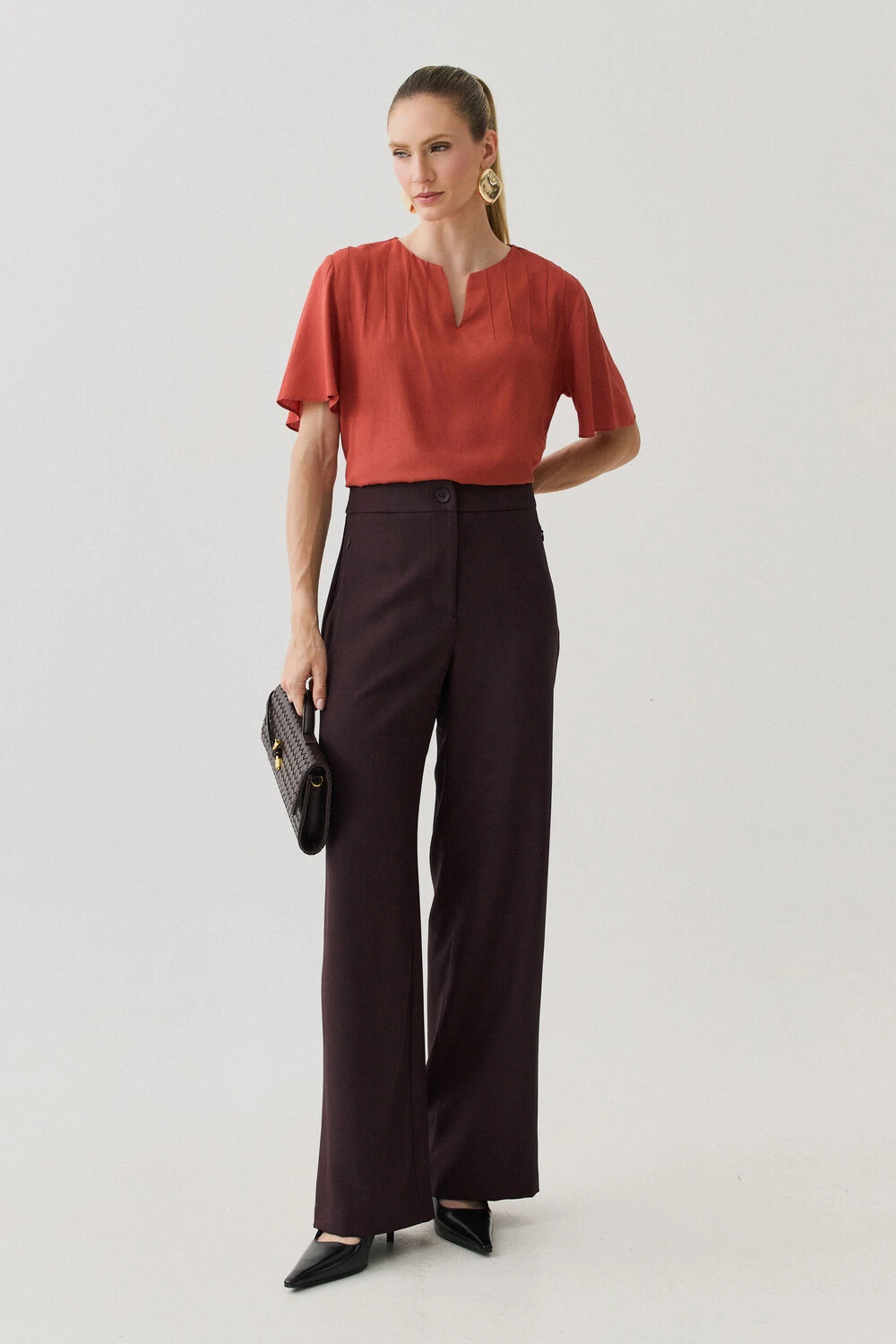 Blusa confeccionada em tecido de viscose leve, com caimento fluido.